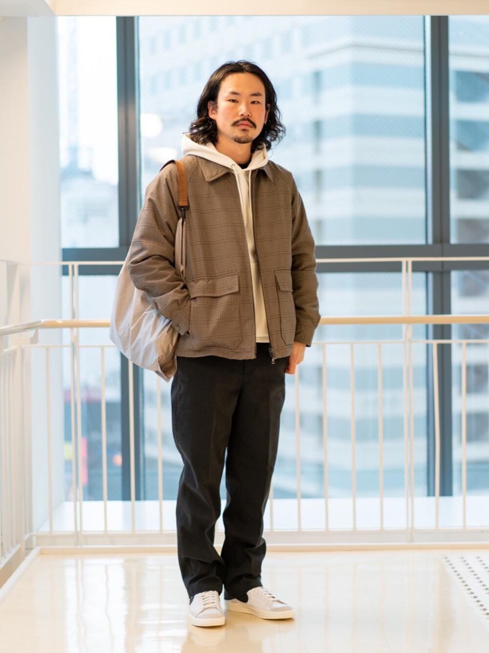 マイクロチェックのブルゾンをメインに大人カジュアルなスタイリングに仕上げました。 ブルゾンのサイズをMでゆったりと合わせました。 スタンダードサプライのバッグは肩掛け、手持ちもでき、実用的で万能なバッグです。