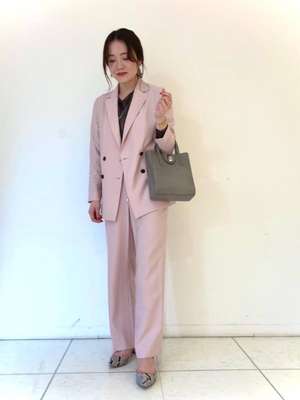 全体をピンクのセットアップでまとめ、インナーはダークブラウンで引き締めました。内側のバイカラーが華やかなバッグがポイントです。