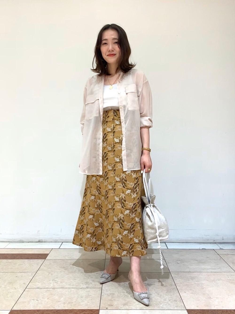 華やかなジャカードのスカートも淡いトーンのアイテムで合わせると柔らかな印象にまとまります。ハイウエストのデザインを活かすため、羽織のシャツは透け感のあるものを選びました。