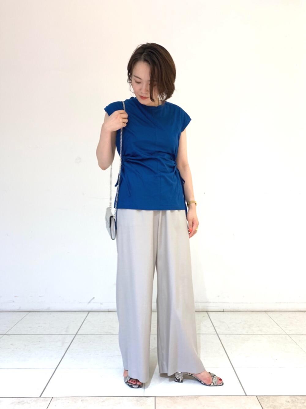 鮮やかなブルーのトップスをメインにしました。ウエストのサイドに絞りのデザインが入っていてウエストラインが綺麗にみえます。パンツはボリュームを出すため普段のワンサイズ上を着用しています。