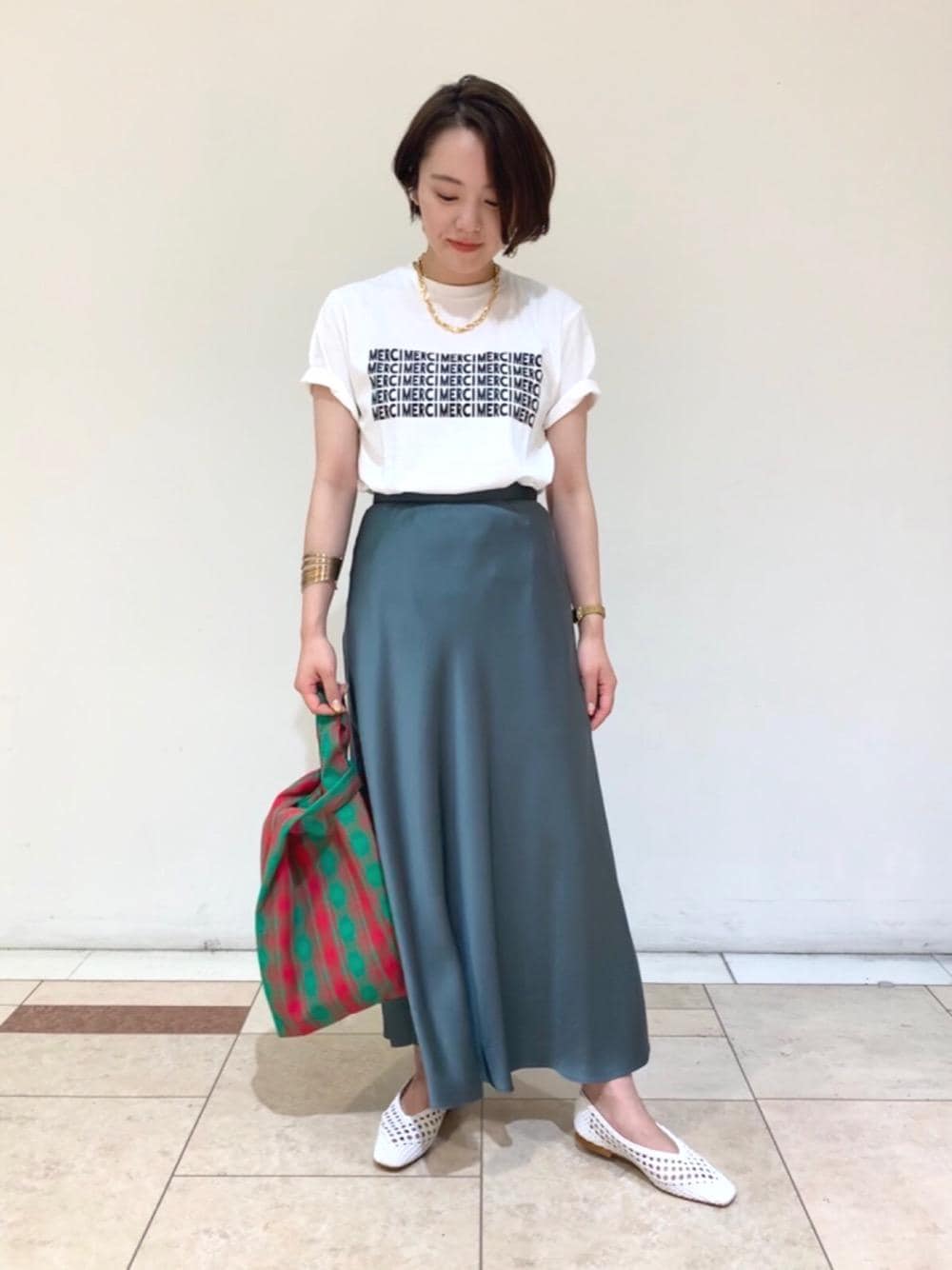 深みのあるグリーンのスカートで秋カラーを先取りしてみました。夏は白のTシャツや小物をあわせて爽やかに。秋にはニットをあわせて着こなしたいです。