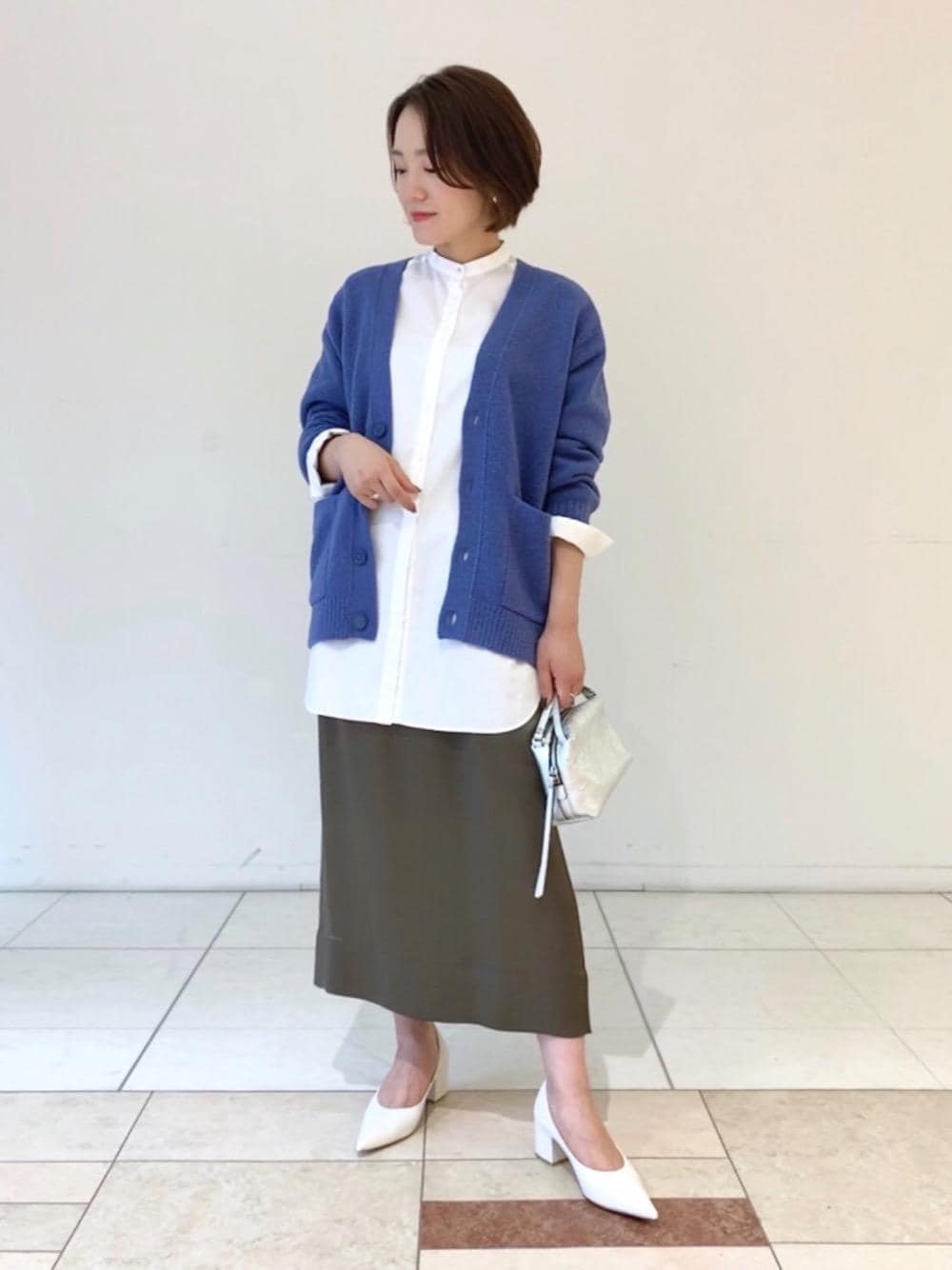 鮮やかなブルーのカーディガンをメインにしたシンプルなスタイリングです。ブルーが映えるようにトップスのシャツはホワイトを選びました。