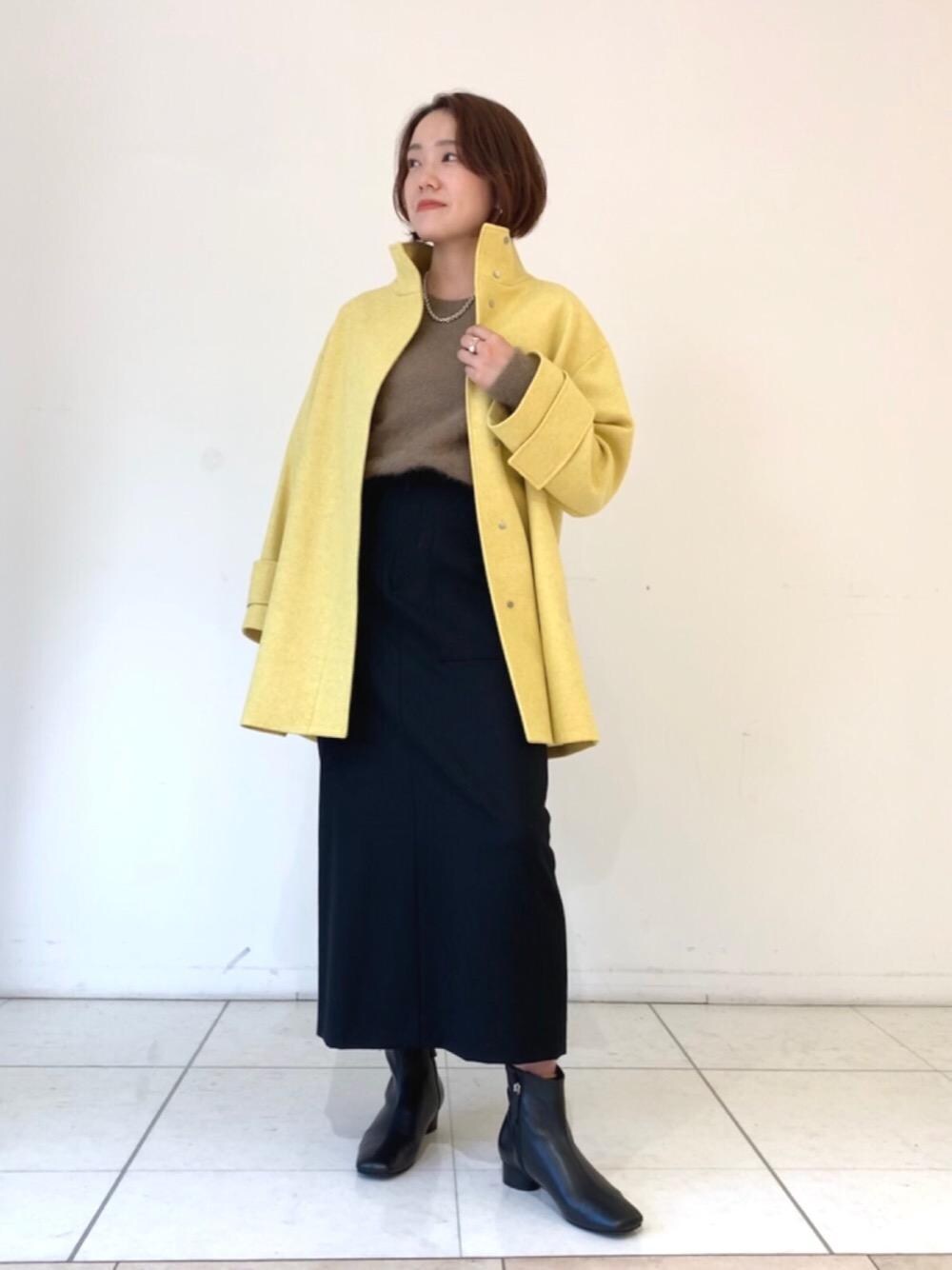 アウターは首元にゆとりのあるスタンドカラーと袖口のベルトが特徴のデザインです。クルーネックのニットを合わせてすっきりと着こなしました。 ミドル丈のゆったりとした形はタイトスカートと合わせてもバランスよく着ることができます。