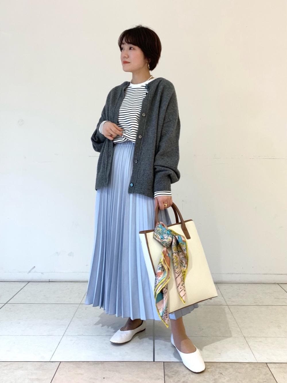 淡いペールトーンのプリーツスカートが主役のお出掛けスタイルです。ボーダーのカットソーを合わせて普段使いしやすくカジュアルダウンしました。