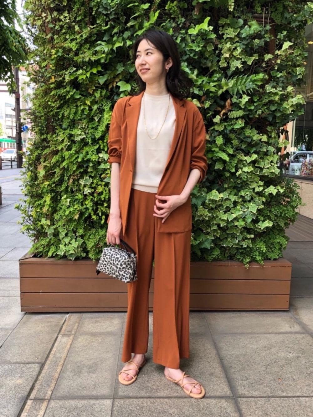 ブラウンのセットアップにフラットなサンダルを合わせて抜け感を出しました。