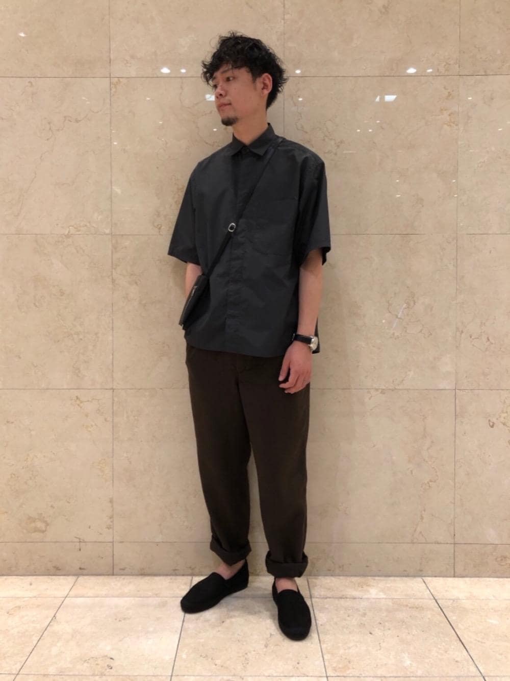 半袖シャツにイージーパンツ。一見するとカジュアルになり過ぎてしまうアイテムでも、深いお色味にサラッとした生地感が合わさると上品なスタイリングに仕上がります。