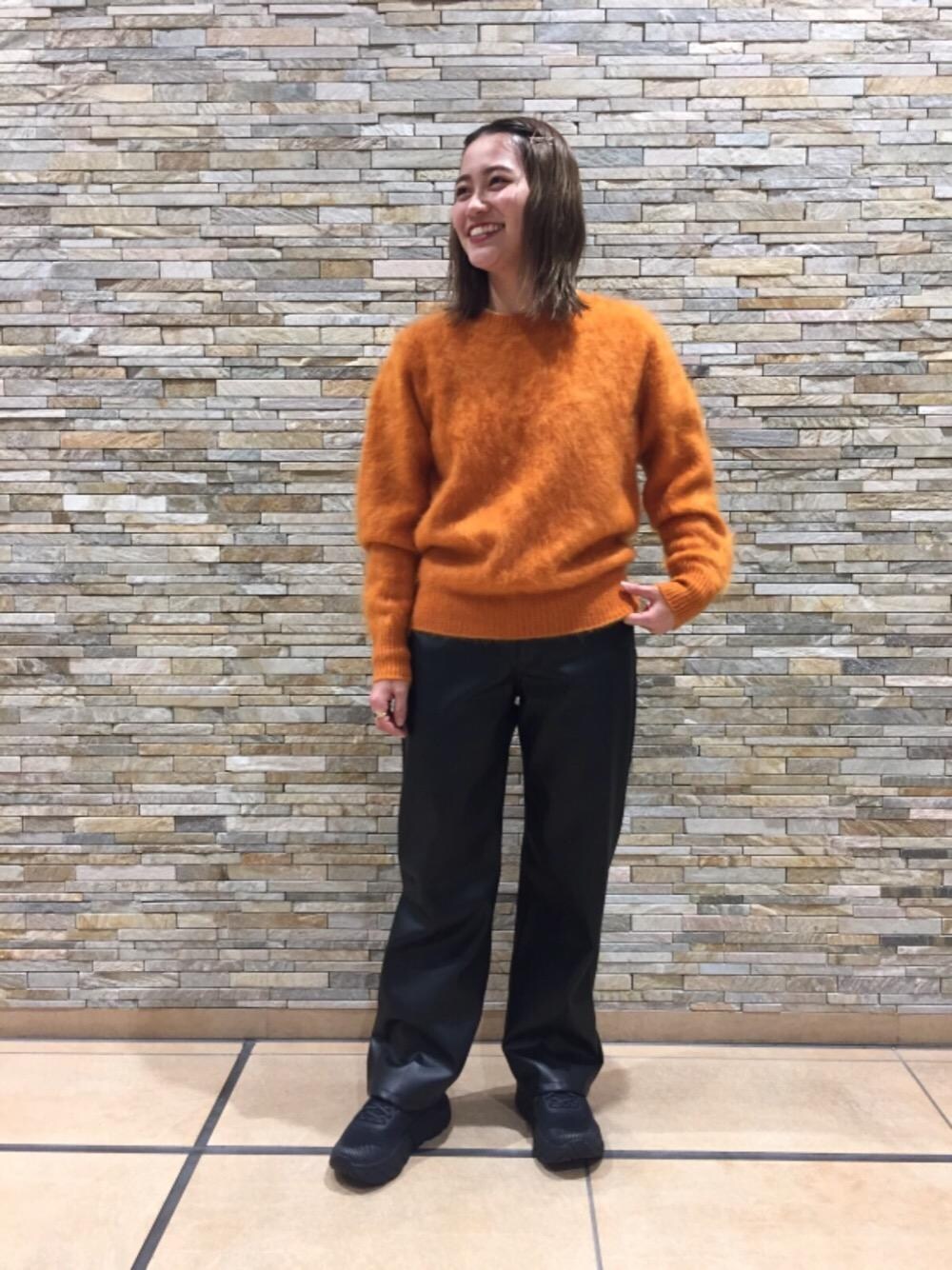 カシミヤセーターにフェイクレザーパンツを合わせカジュアルな印象でまとめました。