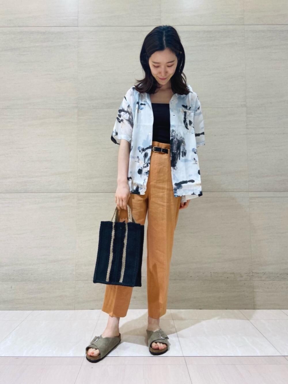 <TOWN>別注の水彩柄を主役に、オレンジカラーのリネンパンツを合わせて夏らしいコーディネートにしました。<TOWN>のオープンカラーシャツはボタンを留めて着ていただいたり、前を開けて羽織としても着用いただけます。