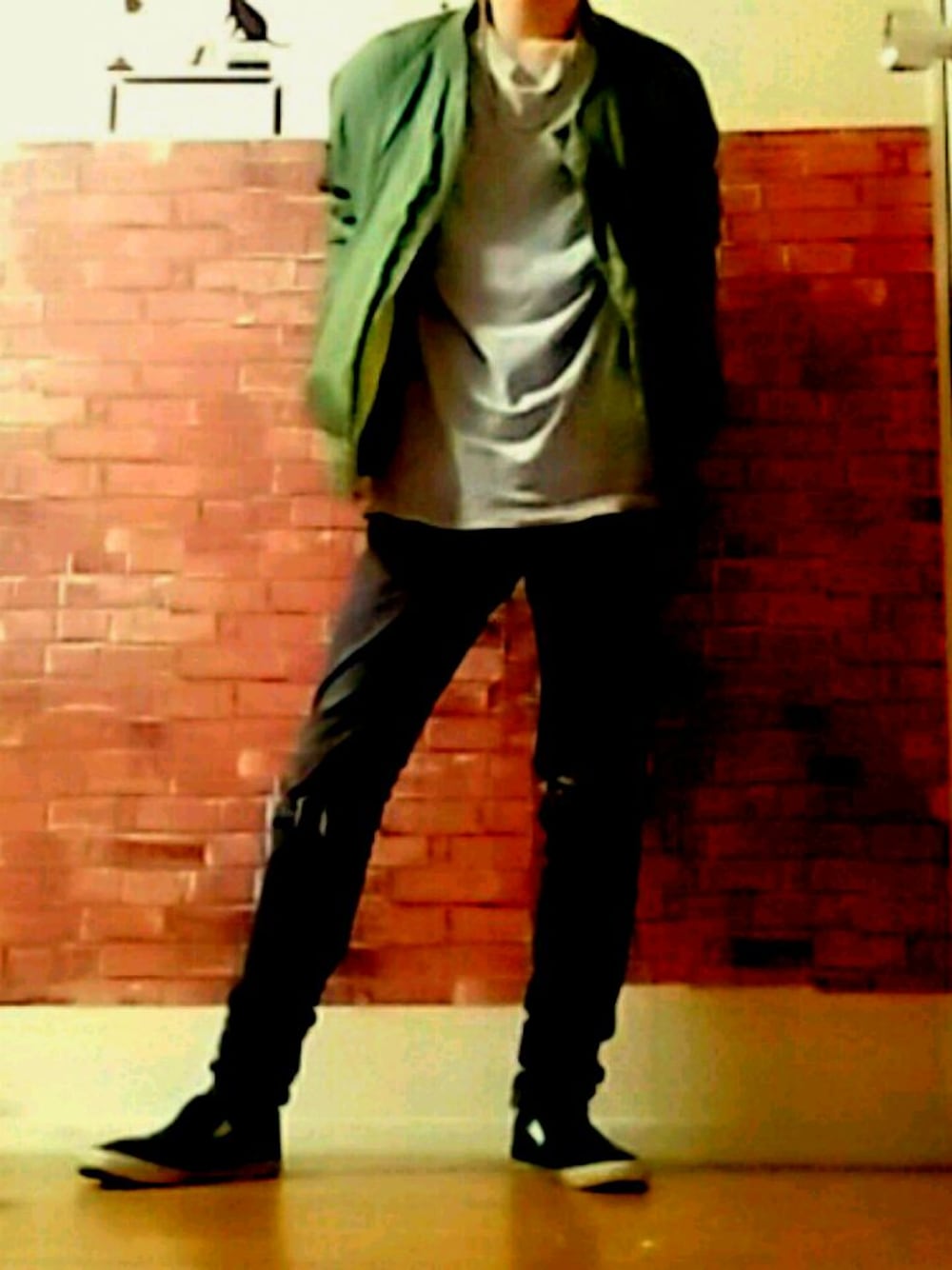誰もが買えるような値段のGUを中心としたファッションです。またパンツとスニーカーを黒にし割合、緑・グレー・黒を2.5:2.5:5としてみました。また首元に金の長いネックレス着用してます。 外でも室内でもお洒落に仕上がると思います