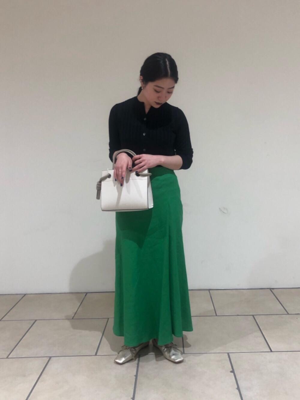スローンのニットはシルク100%で柔らかいながらもサラッとした着心地です。鮮やかな緑色のスカートは着るだけで爽やかさを感じます!