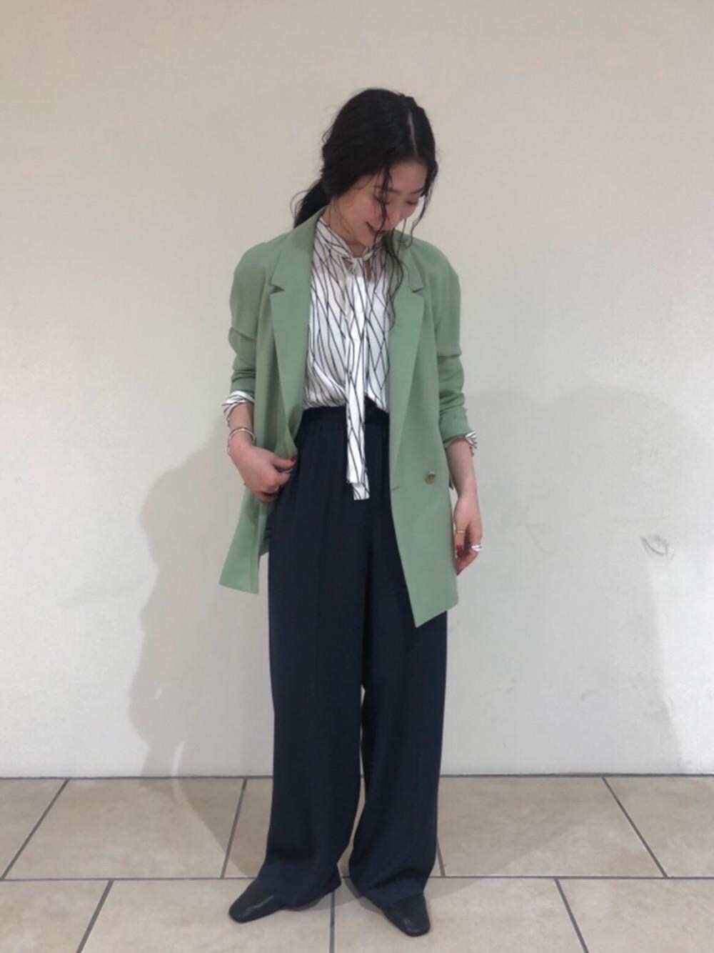 ビジネス用のボウタイブラウスを普段用に落とし込んで綺麗目カジュアルにスタイリングしました。