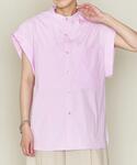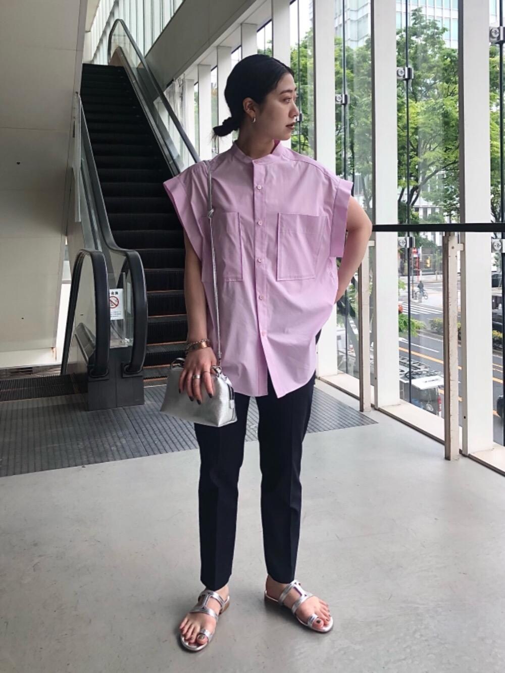 ASTRAETのシャツは二の腕が気になる方でも華奢に見せてくれるデザインです。色味がラベンダーのようなピンクで甘くなりすぎず、丈も長すぎないのでワイドパンツやスカートとも合わせやすいです。今回はネイビーの細身パンツと合わせて小物をシルバーで統一し、爽やかな綺麗目スタイリングを作りました。