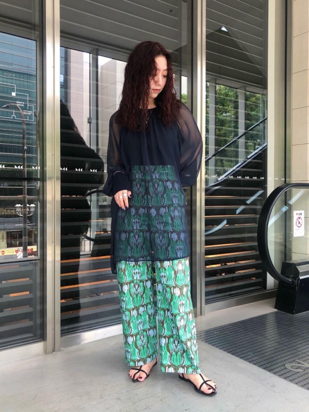 ●身長:156cm ●普段サイズ:34.36 【サイズ感】 パンツは34でウエストぴったりですが、くるぶし上の丈感だった為36で丈を長めに着用しました。 【素材感】 〈HYKE〉のシアートップスはポリエステル100%でサラッとしていて、透け感がある為ネイビー、ブラックをお選び頂いても爽やかな印象で着用頂けます。ネイビーは、濃紺に見えますが動くと青感が出ます。 【コーディネートポイント】 柄のパンツを合わせてより涼しげにスタイリングしました。