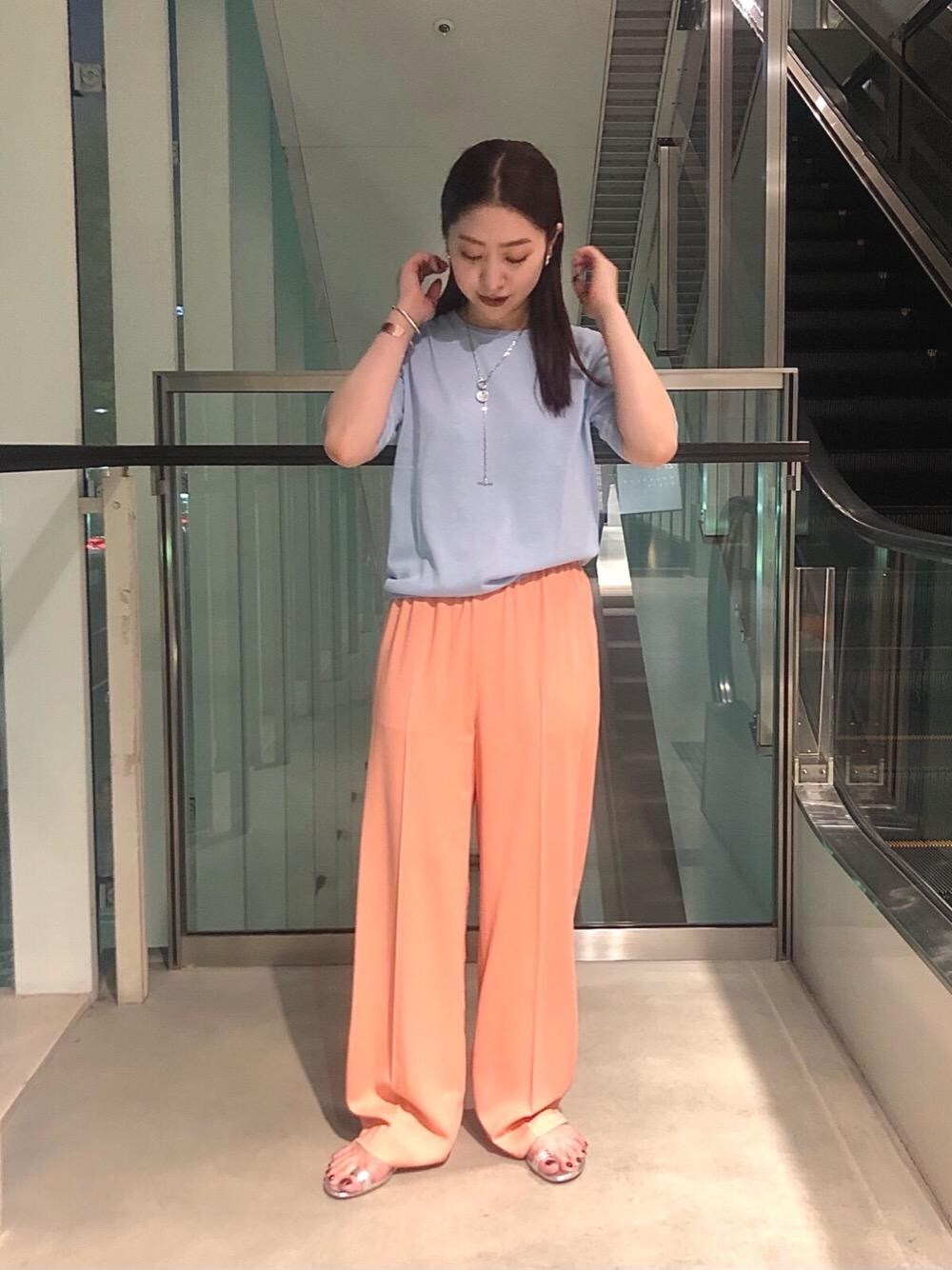 ●身長:156cm ●普段サイズ:34.36 【サイズ感】 パンツのウエストは少し緩めですが、紐で調整ができます。 丈が長めなので腰でゆるめに落としたり、ハイウエストで履いたりとコーディネートによって調整できます。 【着心地】 トップスはコットンとシルクが入っているのでサラッとしながらも柔らかい素材感です。コンパクトなシルエットですが、タイトすぎないため、たくさんのコーディネートに活躍します。 【コーディネートポイント】 ライトブルーとシャーベットオレンジの色合わせでスタイリングしてみました。ベーシックなアイテムでも色遊びをすることでまた違った印象に仕上げられます。