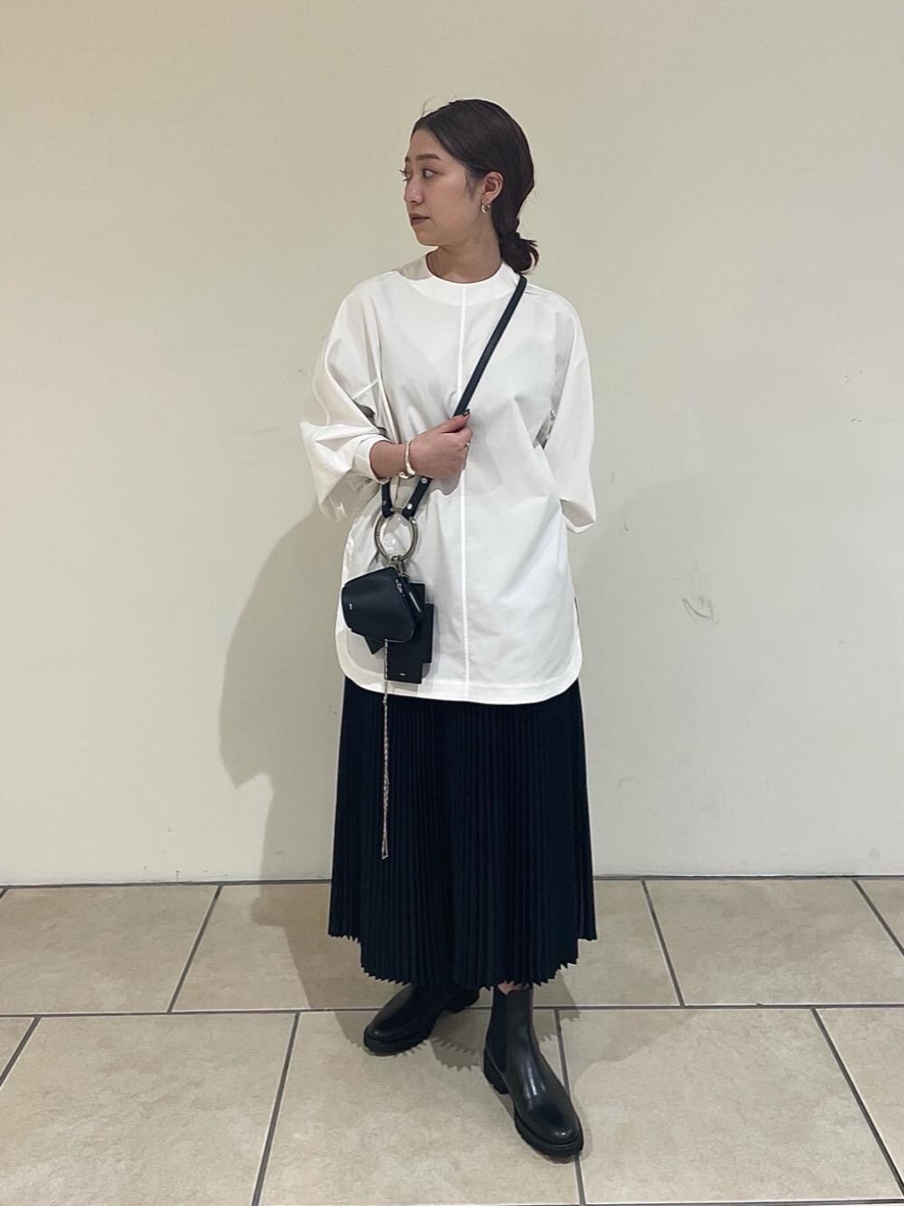 ●身長:156cm ●普段サイズ:1 【サイズ感】 シャツもスカートも普段サイズでぴったりです。 【素材感】 シャツは硬めの生地でハリがあります。 【コーディネートポイント】 〈HYKE〉で固めてみました。