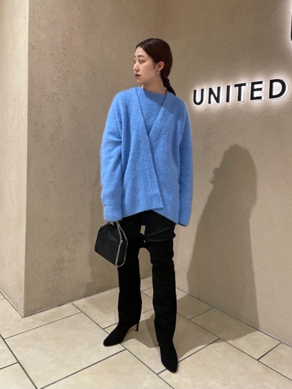 ●身長:156cm ●普段サイズ:36 【サイズ感】 〈ATON〉のニットトップスはオーバーすぎず、イメージよりもコンパクトです。カーディガンはゆったりです。 【素材感】 カシミヤ素材で、とても肌触りが柔らかいです。 【コーディネートポイント】 〈ATON〉のニットをアンサンブルで着てみました。派手すぎない優しいライトブルーの色味はユナイテッドアローズの別注色です。ブーツは折り返しても違う雰囲気でご使用頂けます。