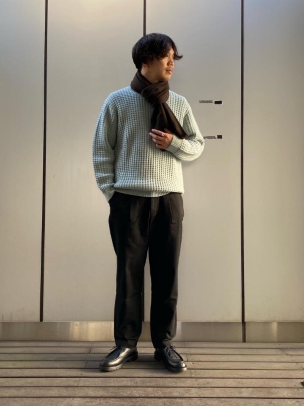 春を意識した配色で、おうち時間にも使える合わせにしてみました。 トレンドのゆったりとしたシルエットながら足元を革靴で締めてバランスを取っております。