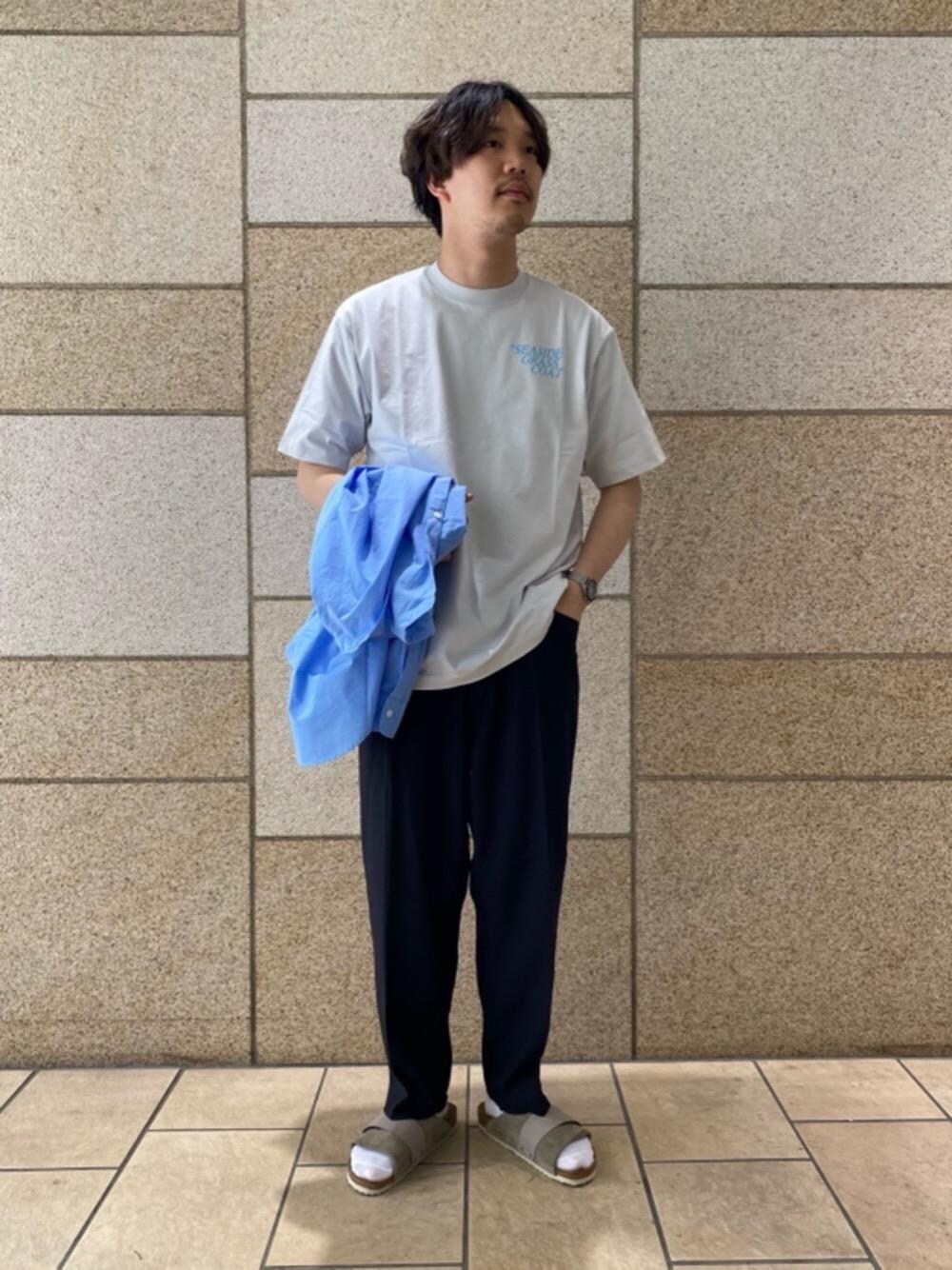 夏を意識した色味で合わせてみました。 ポイントは差し色に使ったライトブルーのシャツです。 落ち着いた雰囲気の中に遊びやリラックス感を連想できるようなコーディネートに仕上がっています。