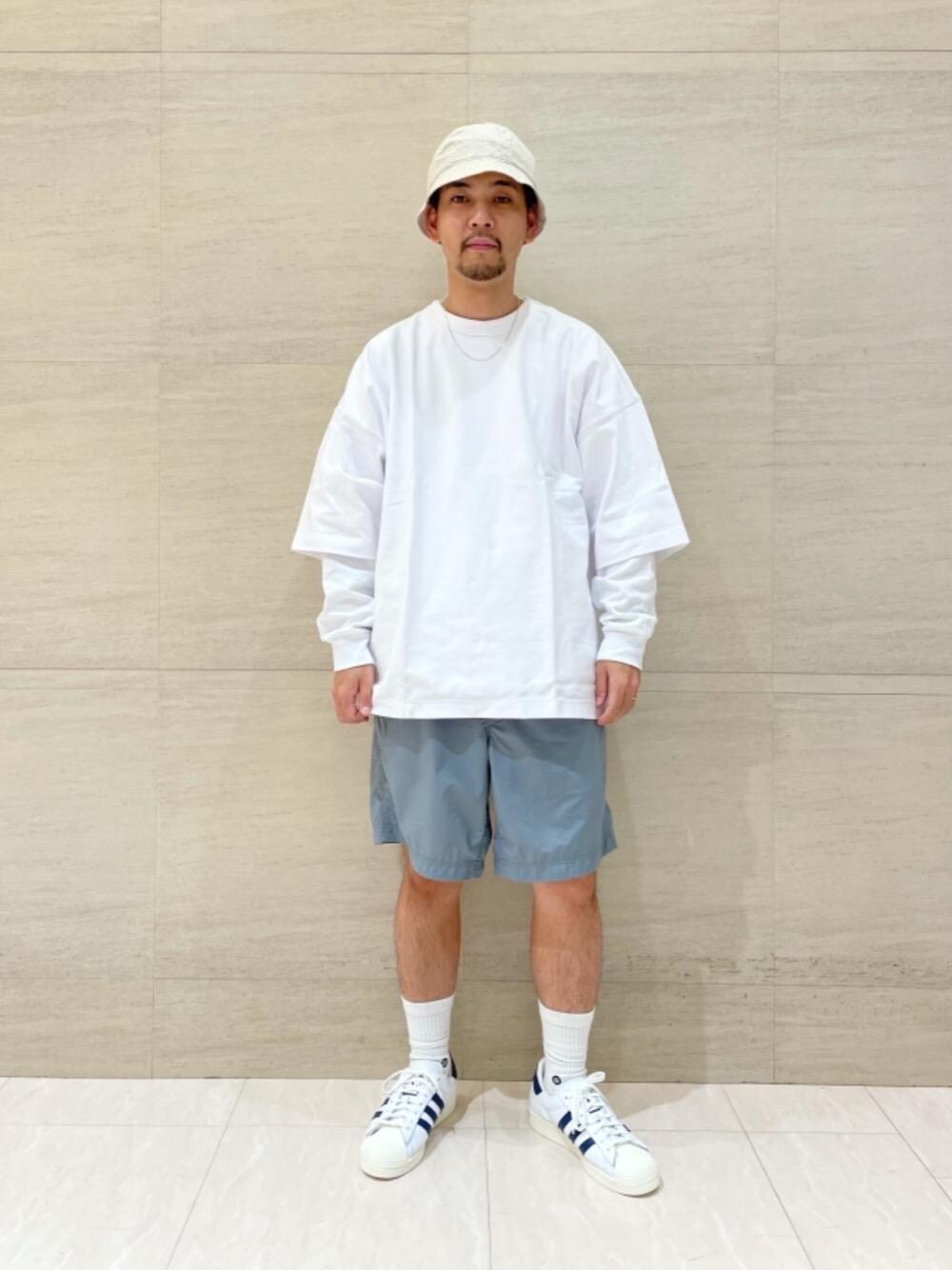10oz ヘビーワイド TシャツのMAX LARGEサイズをメインにコーディネート。名前のとおり非常に大きいサイズ感でショートパンツとの相性は抜群によいです。シンプルで物足りない時は、<NOROLL>のDETOURS HATをプラス。被り心地、シルエットともに非常によくオススメです! 是非お試しください。