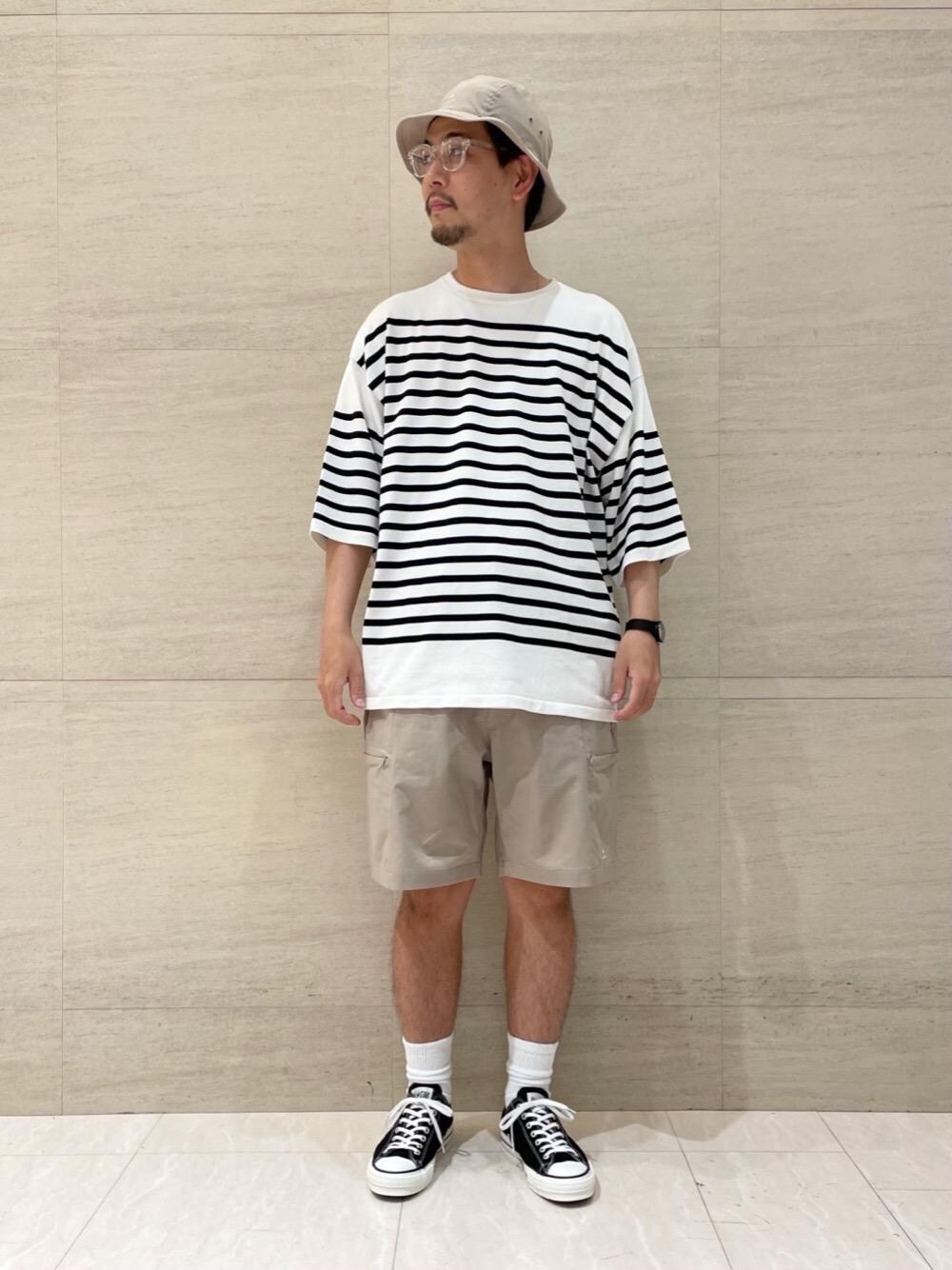 【サイズ感】 ニットTシャツ:オーバーサイズ ショートパンツ:標準的 シューズ:標準的 【素材感・着心地】 二ットTシャツ:厚すぎない生地感。 ショートパンツ:アウトドアアイテムらしい軽い着心地 【コーディネートポイント】 ハットとショートパンツは同素材の物で統一。半袖×ショートパンツでもカジュアルすぎないよう、サイズ感でメリハリをつけたコーディネートです。カットソーをニット素材に変更すると落ち着いた雰囲気になりますので、ぜひお試しください!