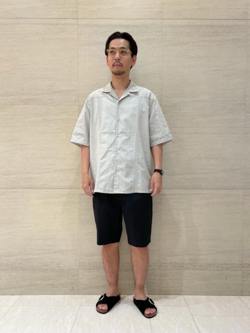 梅雨が明けて本格的に暑い季節がやってきたので、半袖シャツにショーツを合わせ、涼しく過ごせるようにコーディネートしました。カットソーではなくシャツを選択。足元はサンダルですが、スウェード素材の<BIRKENSTOCK>で上品感をだし、大人の雰囲気を意識しました。
