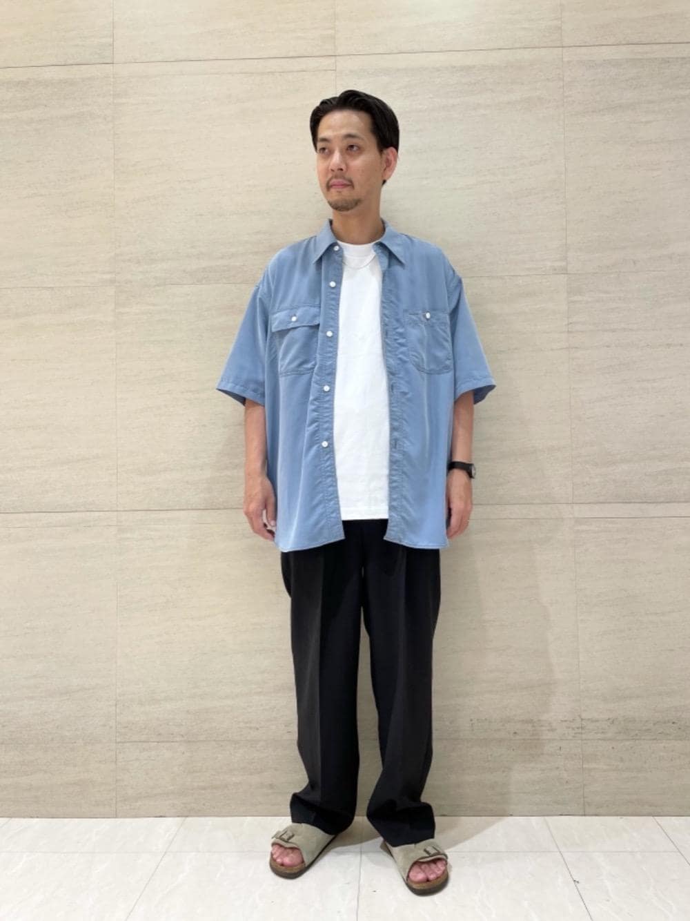 レーヨン×ポリエステルの素材感が特徴的なワークシャツを、ドライタッチで軽い着用感のブラックのスラックスで、シンプルにコーディネートしました。