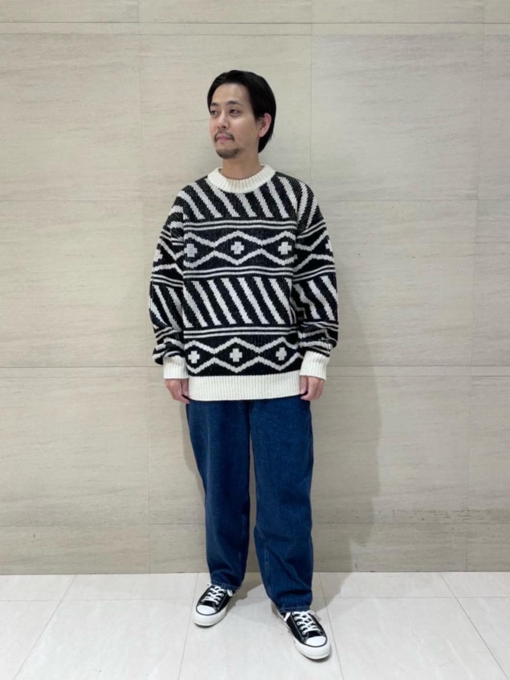【身長】 175cm 【普段のサイズ】 トップス:L-XL パンツ:L-XL シューズ:27.5-28.5 【サイズ感】 ニット:ゆったり目 パンツ:ゆったり目 シューズ:標準的なサイズ感 【素材感・着心地】 ニット:クラシックなウールニット。肌が敏感な方はインナーに長袖着用がおすすめです。 パンツ:渡幅のあるバギーシルエットの為、ストレスなく着用可能。 シューズ:横幅細めの為、幅広な足の方はサイズUPもおすすめ。 【コーディネートポイント】 <PENDLETON>×<monkey time>別注のニットをメインにコーディネートしました。大きく入ったブランドらしい柄が特徴的なので、他はシンプルに合わせると着やすいです。アウターを羽織る季節にもインナーで主張でき非常におすすめです。