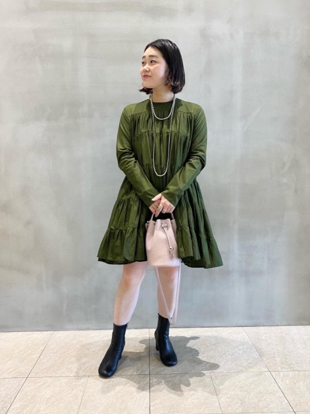 ・年齢:20代前半 ・身長:159cm ・普段サイズ:トップス38/ボトムス36/シューズ23.5cm 【サイズ感】 ワンピース:身幅ゆったり・お袖周り標準 シューズ:標準(やわらかめ) 【着心地】 ワンピースはコットンで軽い着心地です。 ブーツも柔らかくヒールも太めで安定感あります。 【コーディネートポイント】 マーレットの新色カーキのワンピースを主役にコーディネートしました。ショートブーツはつま先がラウンドしていて柔らかな印象で合わせています。バッグでピンクを合わせることでシックになりすぎず女性らしい印象にまとめています。