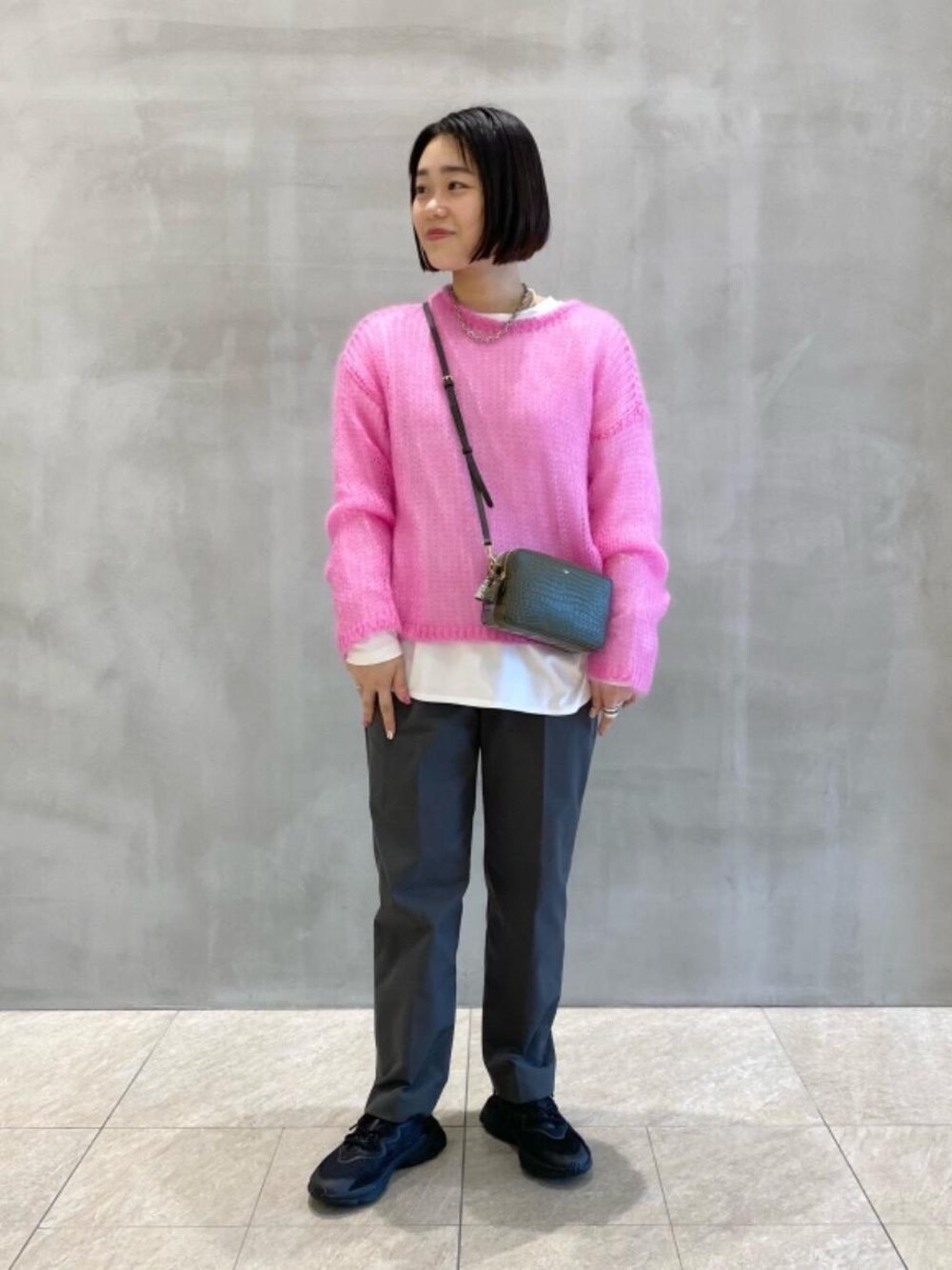 ・年齢:20代後半 ・身長:159cm ・普段サイズ:トップス38/ボトムス36/シューズ23.5cm-24.0cm 【サイズ感】 ニット:ゆったり ボトム:標準 シューズ:ゆったり 【着心地】 ニットとインナーはゆったりしていて軽い着心地。 ボトムは身幅にゆとりがありますがウエストはゴムではなく、フィットします。 【コーディネートポイント】 アクティブにお出かけできるスタイルをコーディネートしました。ピンクにグレーの色合いが明るさと大人っぽさを程よく出してくれるので足元はスニーカーでカジュアルにまとめました。
