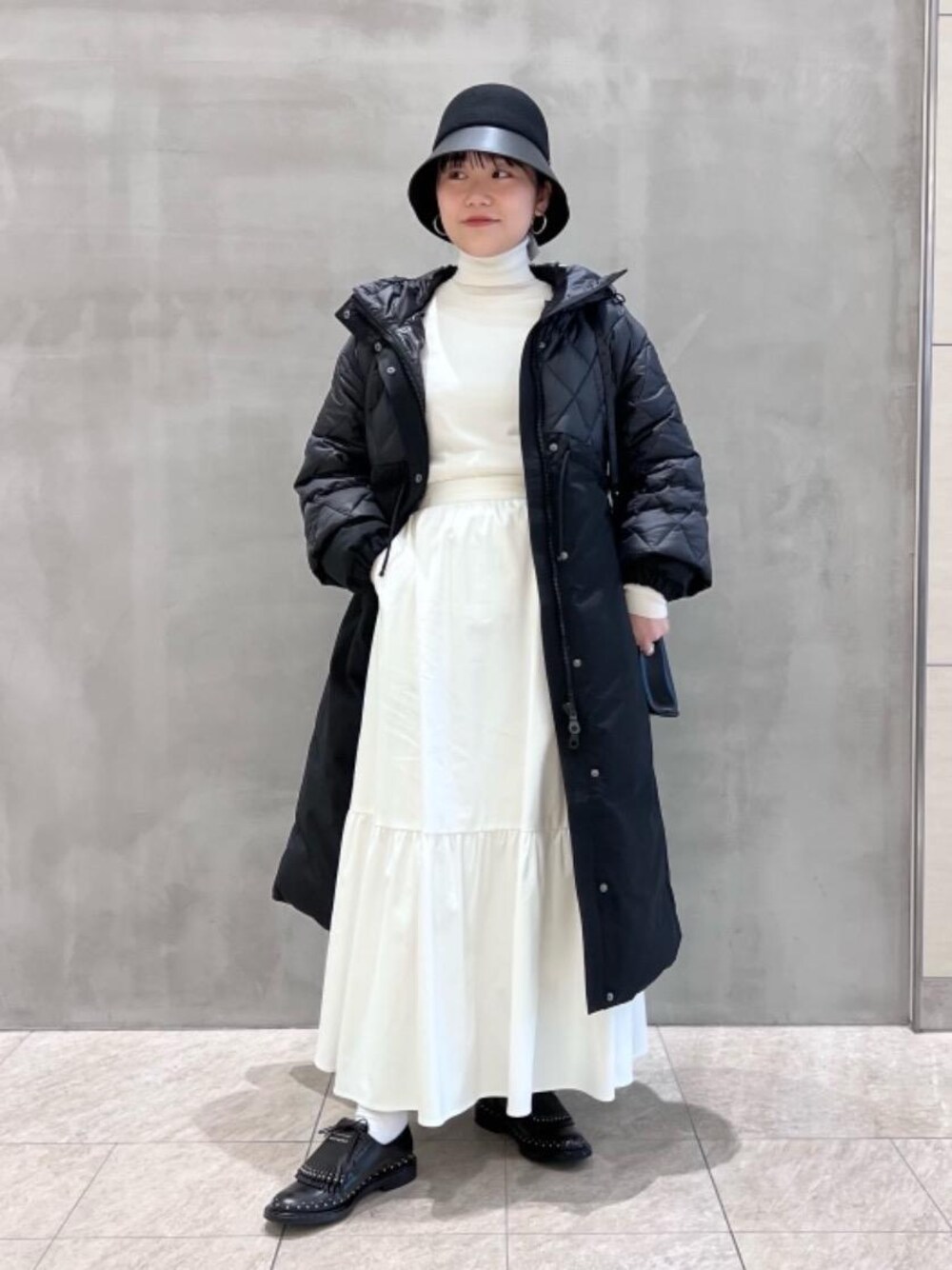 ・年齢:20代後半 ・身長:159cm ・普段サイズ:トップス38/ボトムス38/シューズ23.5cm-24.0cm 【サイズ感】 ニット:標準 スカート:標準 コート:ゆったり シューズ:標準 ハット:ややゆったり 【着心地】 タートルニットは柔らかい着心地 スカートはウエストがゴムではないのでフィットします 【コーディネート】 トップスとスカートでホワイトコーデにして、小物とアウターをブラックで統一しました。IRIS47のハットは生地の切り返しがありエッジが効いています。甘めとモードをMIXしたコーディネートに仕上げました。 churchのシューズはタッセル部分を外してもお召しいただけます。