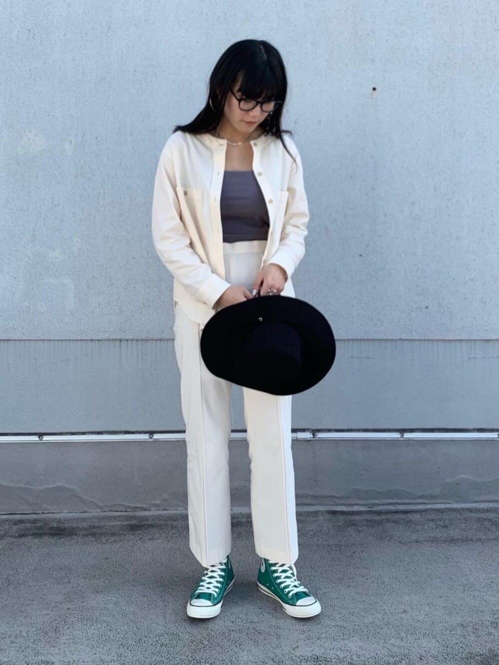 ヴィンテージライクなコットン素材が特徴のセットアップにグリーンのコンバースとハットを合わせカジュアルにスタイリングしました。 クロップド丈のパンツはサイドファスナーですっきりとした腰回りなので、トップスインもスマートに決まります。