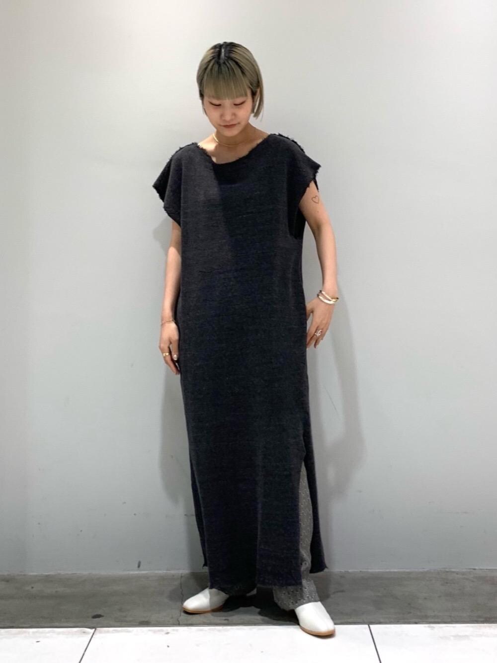 <R JUBILEE>のワンピースは切りっぱなしのデザインが目を惹きます。スリットが深く、パンツとのレイヤードも様になるのでオススメです!