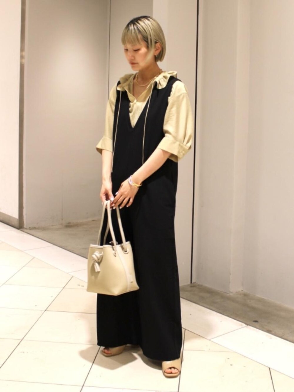 首元のフリルのデザインと艶のある素材感が魅力的なブラウスを、黒のオールインワンで女性らしく合わせました。デザイン性のあるブラウスなので、全体の色はあえて黒とベージュで統一しました。