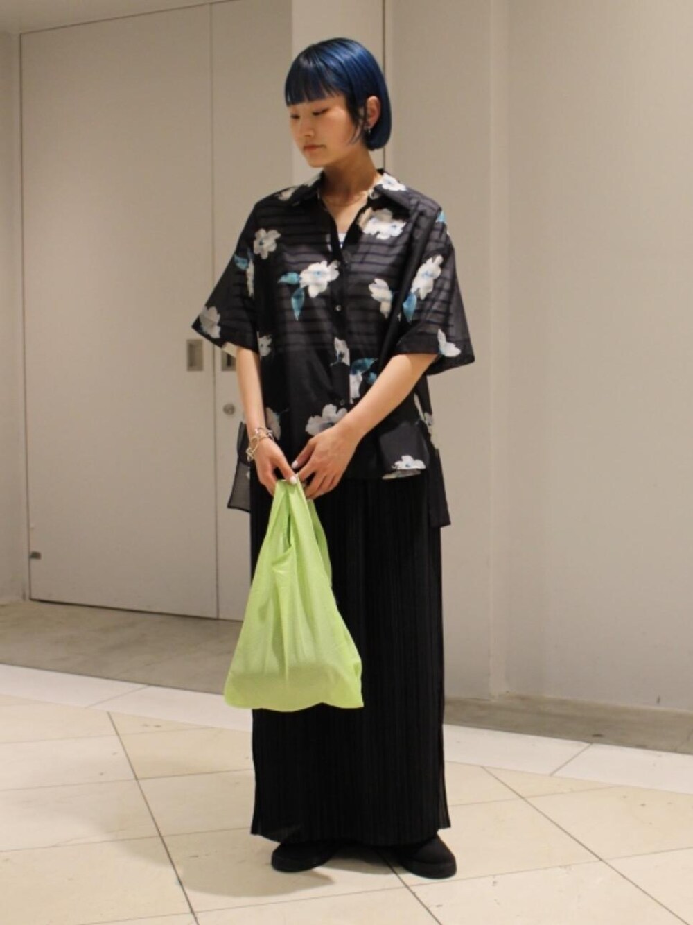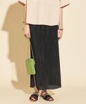 一枚で着映えするシアーシャツを主役にしたコーディネート。インナーにボーダーを忍ばせ、新鮮なスタイリングにしました。スカートはあえていつもよりサイズを上げ、長めに履くことでトップスとのバランスをとりました。
