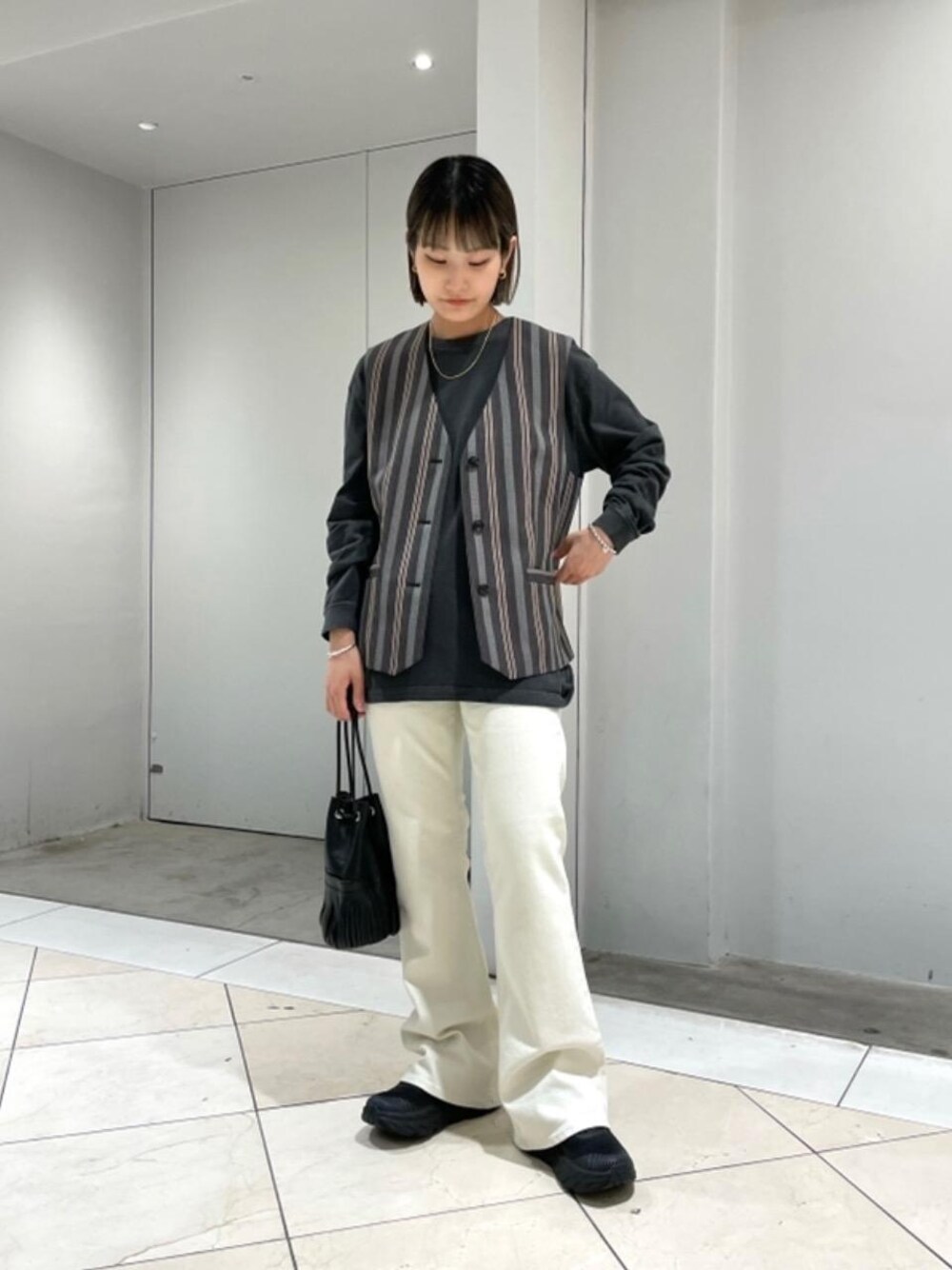 ●身長:157cm ●普段サイズ:トップスS size/ボトムスS or Msize/シューズ24cm 【サイズ感】 カットソー:身幅はややゆったり、着丈長め パンツ:ウエストゆったりめ 【素材感】 ベスト:裏地がついており、厚手の素材 パンツ:とても柔らかい素材 【コーディネートのポイント】 ご好評いただいております別注<Shinzone>のデニムとストライプのベストを合わせ、カジュアルながらもトレンド感のあるコーディネートに。ベストはプラスするだけで全体が締まるので、秋口におすすめです。