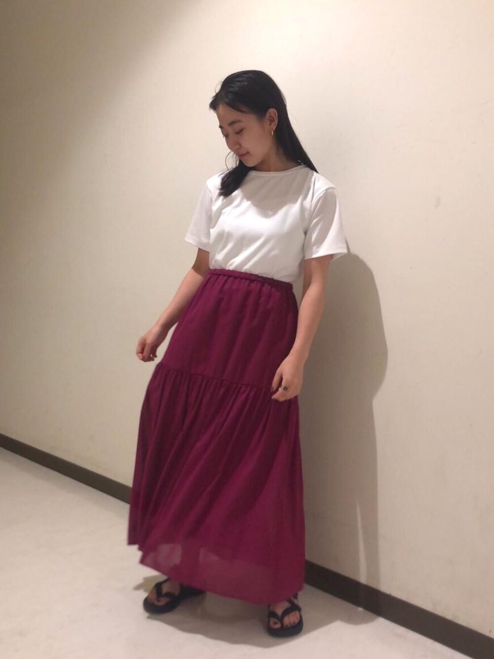 普段私はピンク系が可愛くなりすぎてしまうので取り入れることが少ないのですが、この大人な色とシルエットだと簡単に取り入れられてウエストもゴムなので楽ちんです! Tシャツに合わせてシンプルスタイルに仕上げました。足元は夏らしく流行りのスポーツサンダルに。 しっかりと色が染まっているのにお休みの日に着てもやりすぎない感じがとても使いやすくてお勧めです。