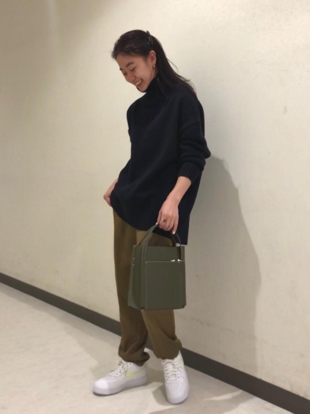 タートルニットに光沢感のあるテーパードパンツを合わせました。 冬でも足元はスニーカーでロゴマーク部分のイエローカラーもポイントです。 アウターで中に着る洋服が隠れても足元が可愛いコーディネートです!