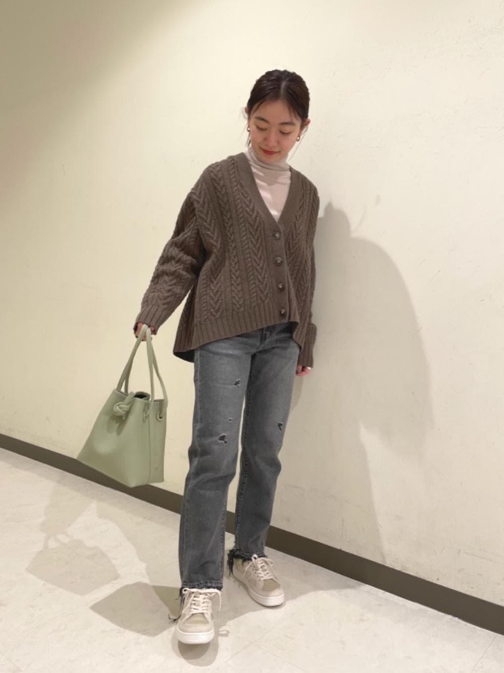 Vネックのケーブルニットカーディガンは身幅がゆったりしていて前より後ろ丈が長く、ボトムス問わずに楽しんでいただけます! 可愛くなりすぎないようバックの素材でレザーを使い、パンツはvintage感漂うデニムにしました!ゆったりしたサテンパンツと合わせても可愛いと思います!