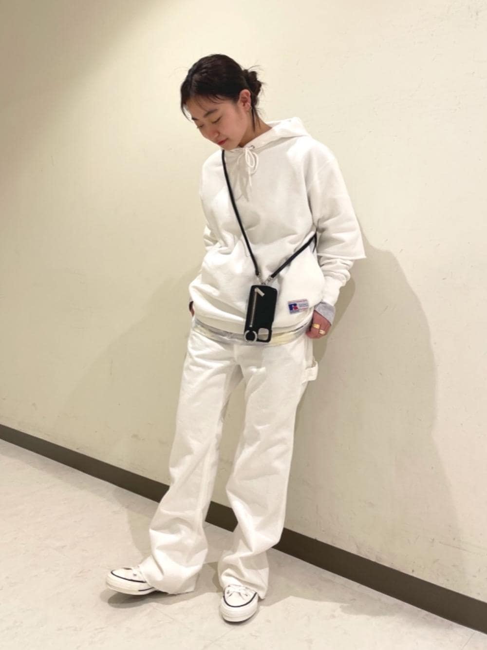 ワントーンコーデでボーイッシュながらも小物やアクセサリー使いで女性らしさを出してみました。重ね着しているように見えるパーカーは繋がっていてフード部分の形がきれいなのでお団子にして首周りスッキリ見せるとより全体がまとまりやすいと思います ! 洋服のサイズ感などご不明点ございましたら気軽にお電話ください!