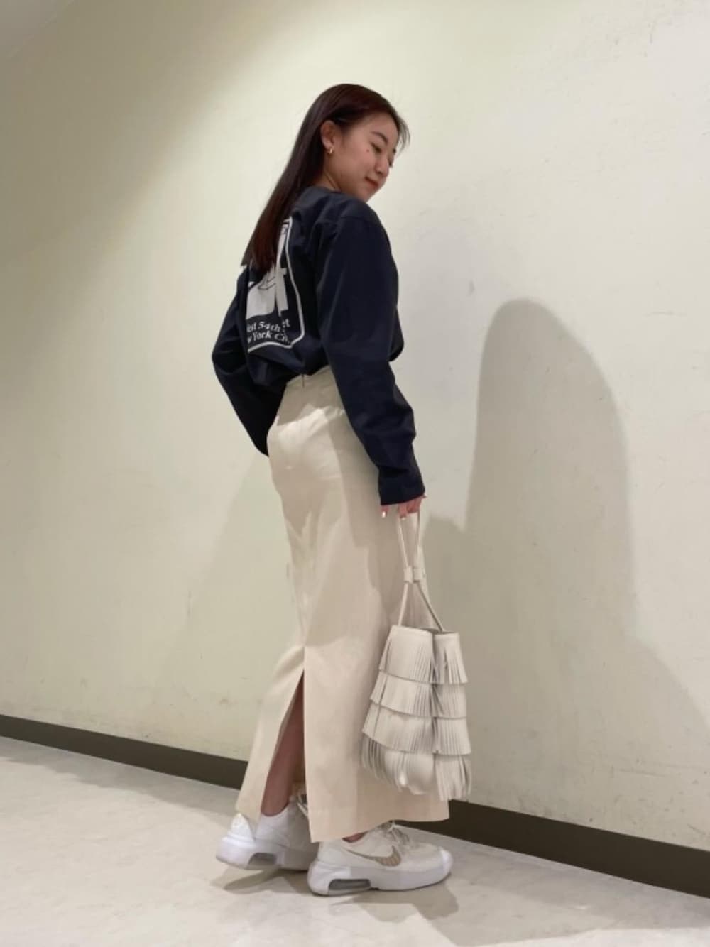 「STUDIO 45」と別注のTシャツはビンテージ感漂うグレーがかった黒色でこなれ感、柔らかさが出て1枚あるとどのシーズンも楽しめておすすめです! バックスリットのロングスカートはサラッとした風合いにスポーツで培った私のふくらはぎも歩く度に細く見せてくれるのでお気に入りです。 スリットがあるスカートとの足元合わせに迷われたら是非この白のスニーカーで合わせていただくと可愛く仕上がりますので是非お試しください!