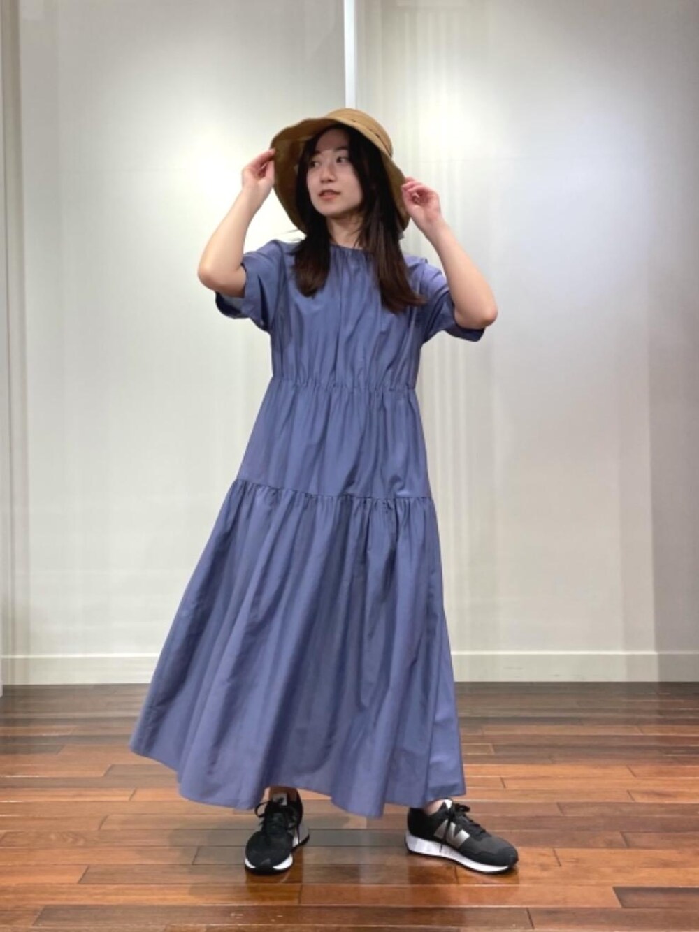 ワンピースは肌着のラインなど透けにくいスリップ付きなので安心してお召し頂けてます。着用感はシルクが入っているので真夏でも過ごし易いです。国内別注のNB237スニーカーは履き心地も良く、軽くてお出かけにもお勧めです!私はいつも通りのサイズで着用しています。 (普通体型、 身長153.8cm、 足23.5cm)
