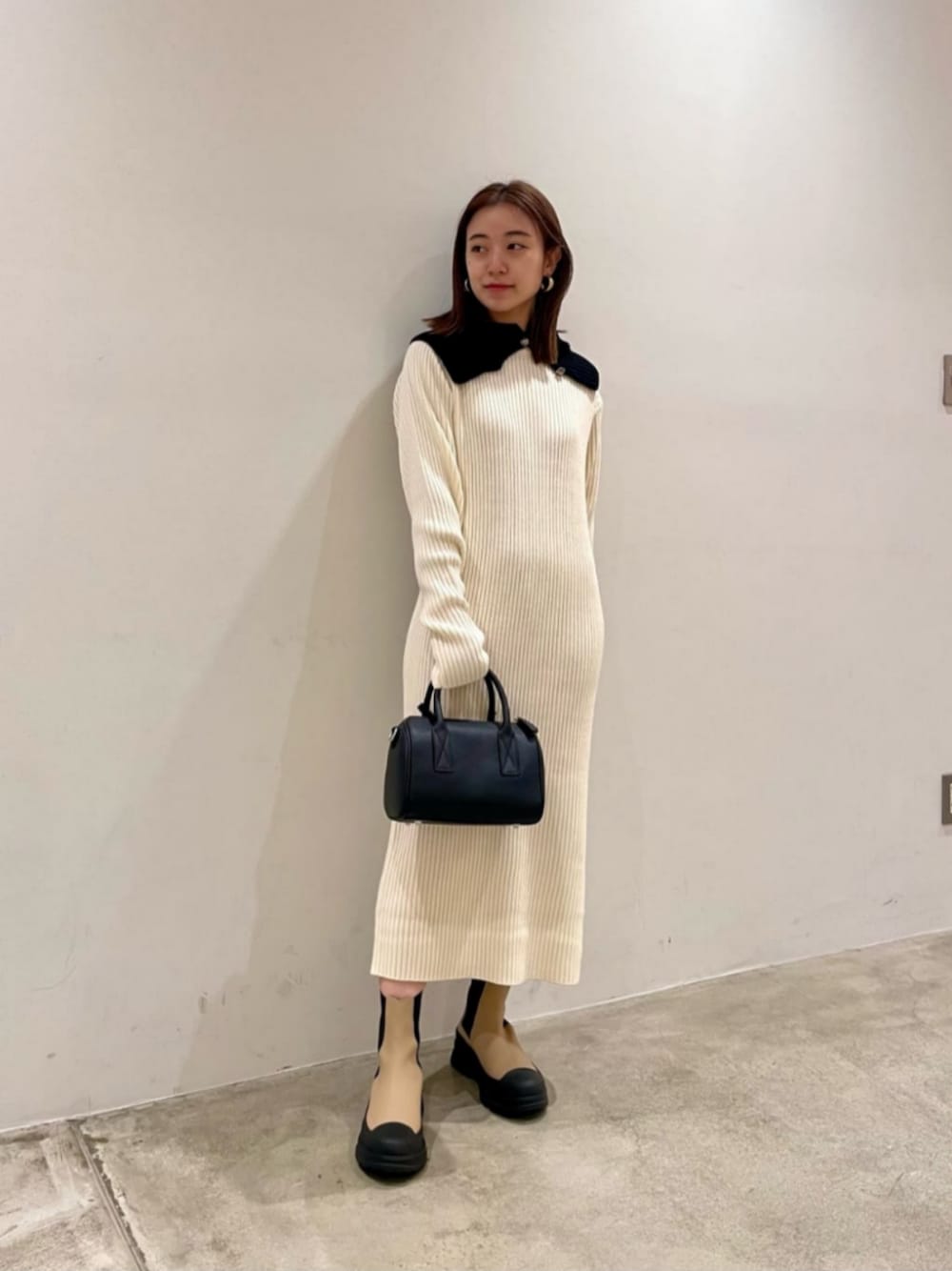 【サイズ感】 ワンピース : ややゆったり 【コーディネートポイント】 白ベースにトレンド感あるデザインのワンピースとブーツを組み合わせて可愛らしすぎないコーディネートに仕上げました。