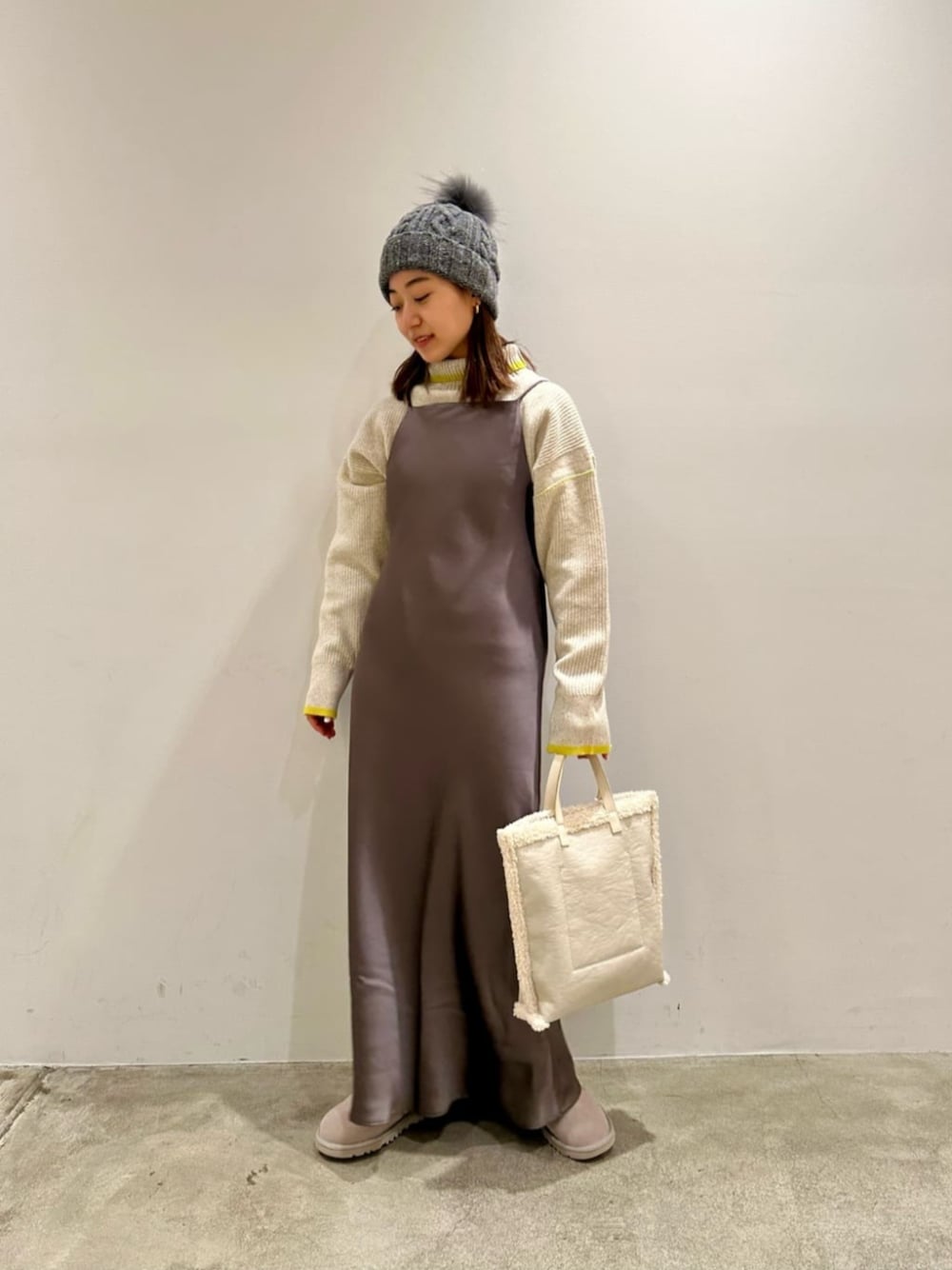 【サイズ感】 ワンピース : ややゆったり ニット : ゆったり 【コーディネートポイント】 綺麗めなワンピースとカジュアルな小物を合わせました。 デイリー使いにもお勧めなコーディネートです。