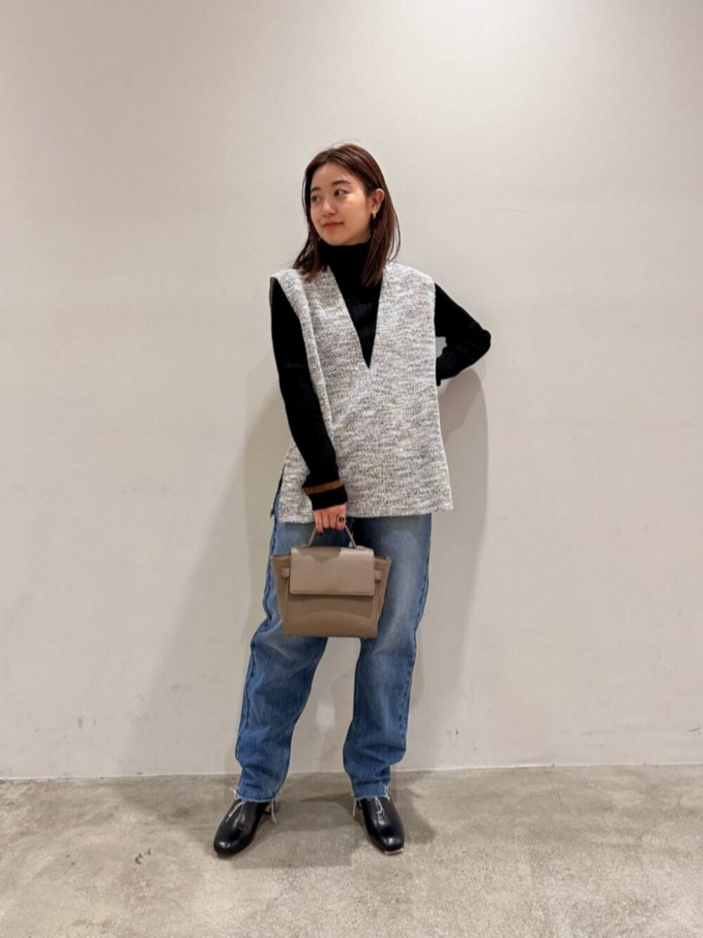 【サイズ感】 ベスト : ゆったり トップス : ぴったり デニム : ゆったり 【コーディネートポイント】 シャツにも使えるベストにデニムを合わせてデイリー使いもしやすい組み合わせにしました。