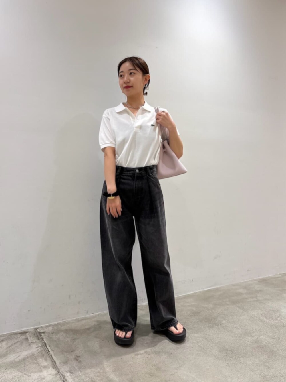 【サイズ感】 トップス : ややゆったり ボトムス : ゆったり シューズ : 丁度いい 【コーディネートポイント】 シンプルで可愛いポロシャツにゆったりめのデニムを組み合わせました。 トレンド感あるサンダルも相性抜群です!