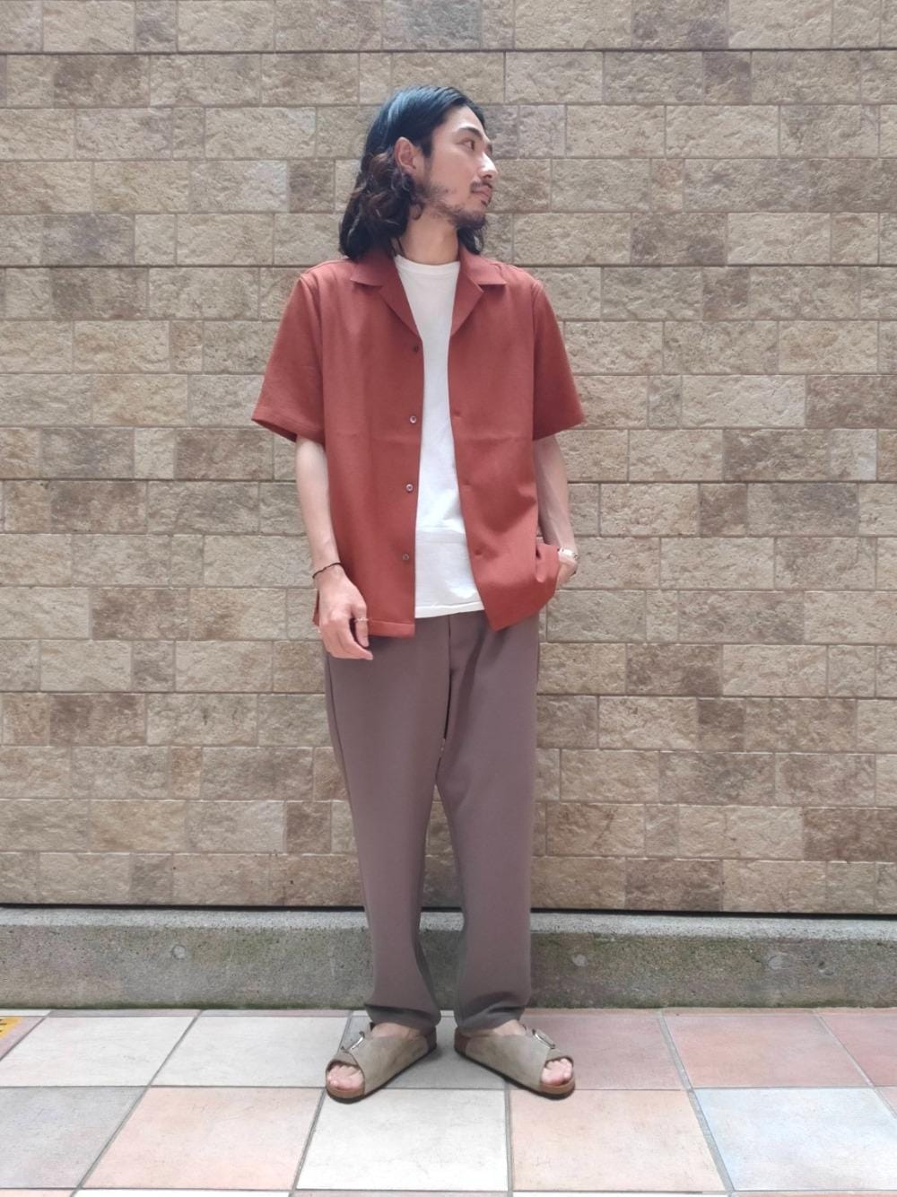 ・年齢:20代後半 ・身長:174cm ・体重:58kg ・普段サイズ:トップス L/パンツ M,L/シューズ 28cm 【サイズ感】 トップス:ゆったり パンツ:ゆったり 【素材感】 トップス:肌離れがよくさらっとしています パンツ:とろみのあり、落ち感があります 【着心地】 トップス:快適な着用感 パンツ:ゆったりしていてリラックス感があります 【コーディネートポイント】 ブラウン、ベージュ系のワントーンでまとめたスタイリングです。 夏はスタイリングが単調になりやすいので色味を入れていただくのがおすすめです。