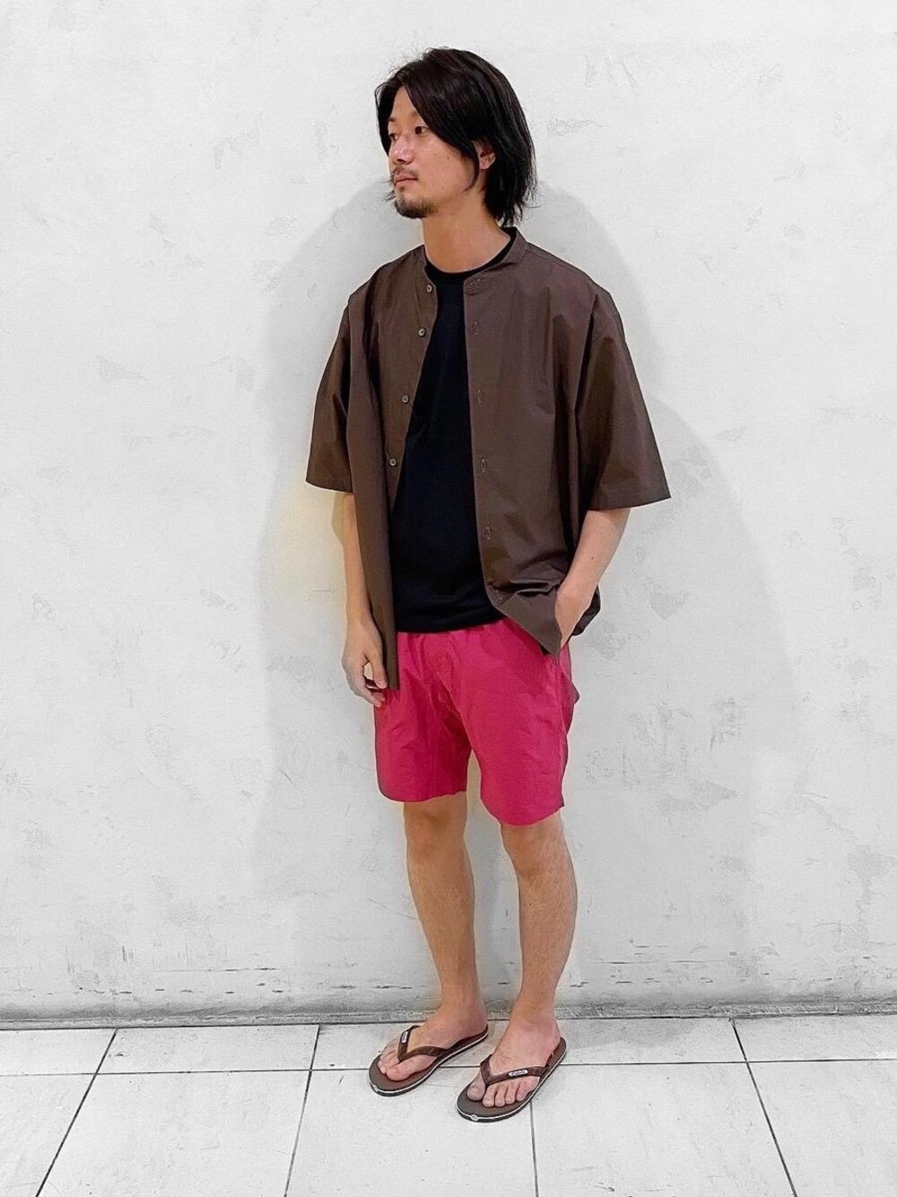 バンドカラーシャツを使った夏コーデ。 パンツはピンクと難しいイメージを持つ方も いますが、色合いを揃える事で なんとも言えない統一感を出してます!
