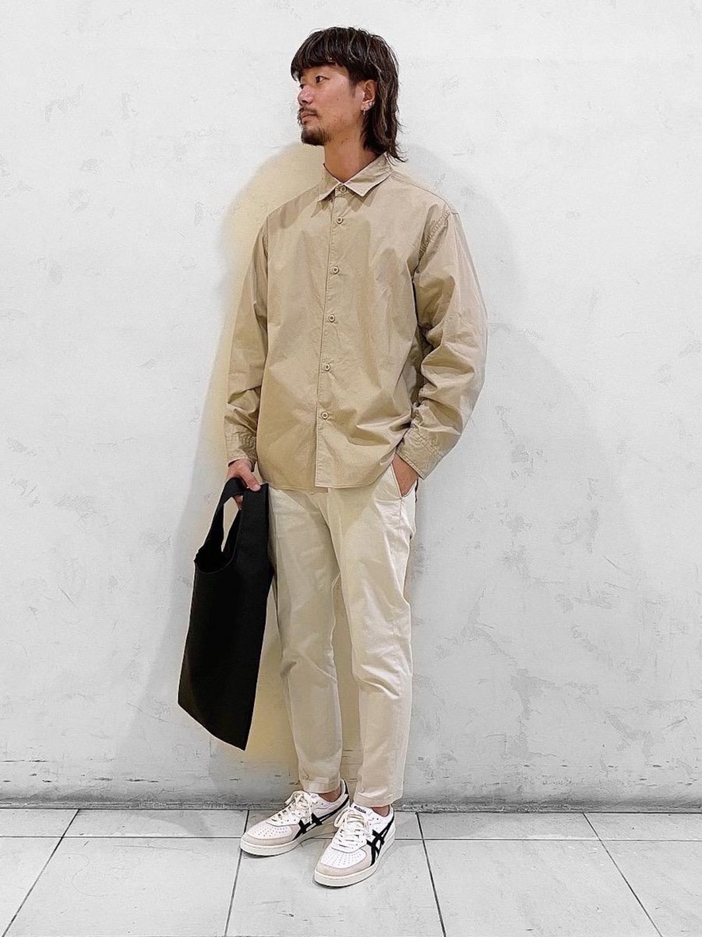デザイン性のあるベージュのシャツを一つコーデに 加える事でシンプル過ぎないコーデへと男性でも合わせやすい組み合わせだと思い組んでみました