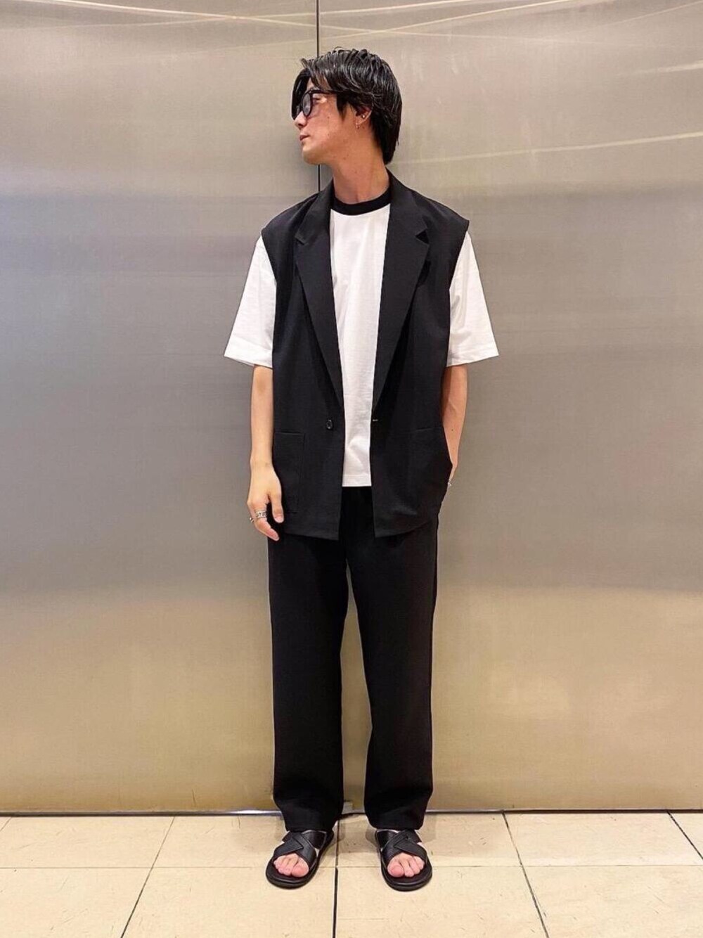 ●年齢:30代前半 ●身長:176cm ●普段サイズ:トップスL/ボトムスM/シューズ27cm 【サイズ感】 トップス:ゆったり ボトムス:ややゆったり シューズ:ジャストサイズ 【素材感】 トップス:ドライタッチな清涼感 ボトムス:ハリ感があり冷んやり素材 【コーディネートポイント】 Tシャツだけでは物足りないなと思った時にサラッと羽織れるテーラードジャケットベースのベストとなっており、リンガーTシャツと組み合わせる事によってより首元の黒が際立ちます。