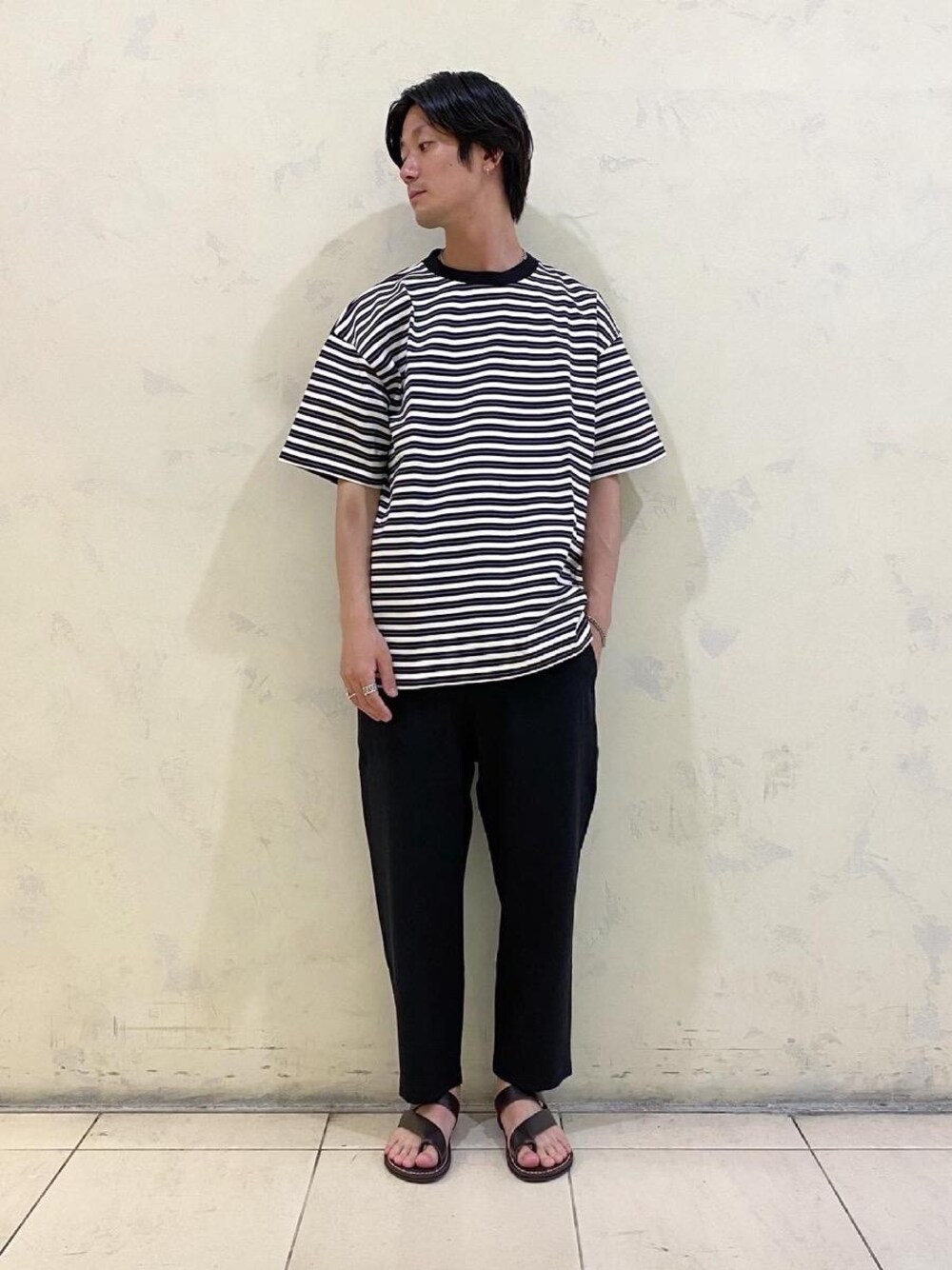●年齢:30代前半 ●身長:176cm ●普段サイズ:トップスL/ボトムスM/シューズ27cm 【サイズ感】 トップス:ややゆったりワイドシルエット ボトムス:ややワイドの半端丈 【素材感】 トップス:生地がしっかりとした素材 ボトムス:ハリ感と凹凸感 【コーディネートポイント】 足元をブラウンのトングサンダルで合わせ黒と紫のボーダーだけに注目が行かないように間のパンツを黒で全体的にまとまりがでるように組み合わせてみました。